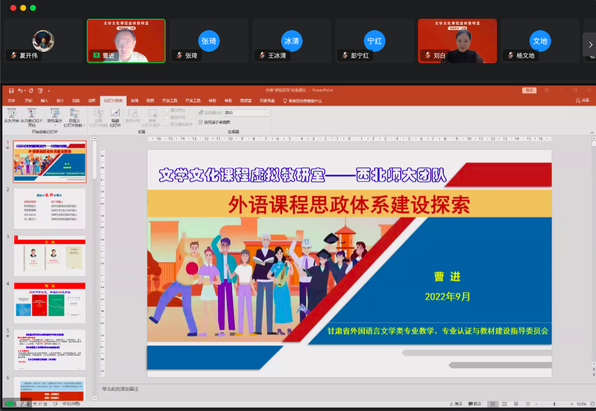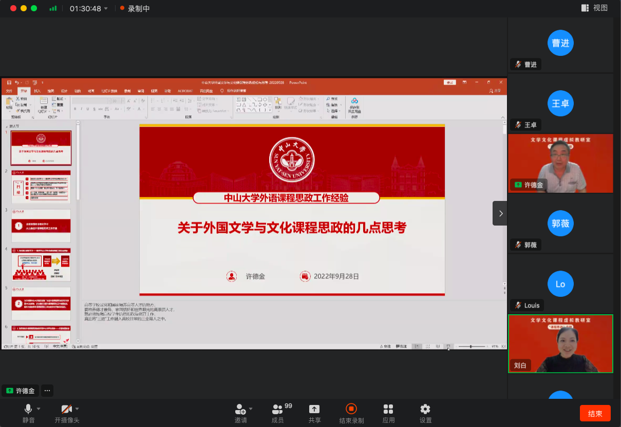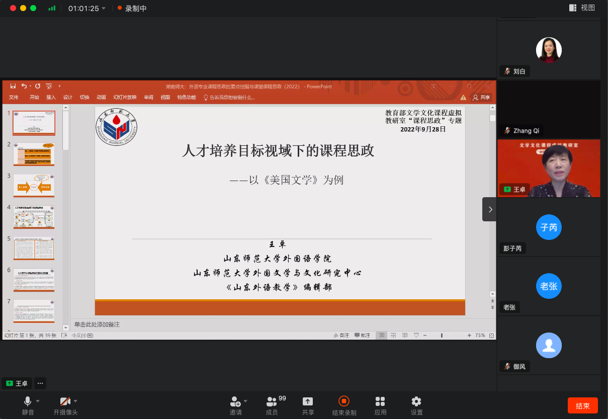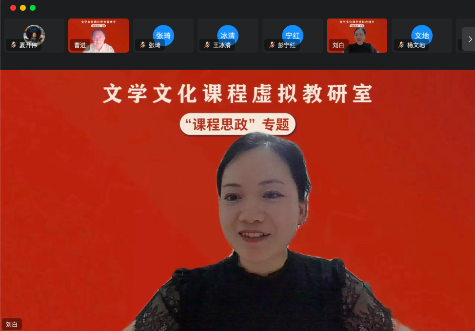 (通讯员 夏开伟)2022年9月28日,教育部首批虚拟教研室建设点“文学文化课程虚拟教研室”通过钉钉平台举行了“课程思政”专题教研会。此次教研会邀请了西北师范大学曹进教授、山东师范大学王卓教授、中山大学许德金教授以及上海外国语大学程心副教授进行讲座和分享。会议由15vip太阳成15vip太阳集团官网副院长刘白教授主持,参与者涵盖了中南大学、重庆大学、南京师范大学、郑州大学、浙江师范大学等国内数十所高校的教师。