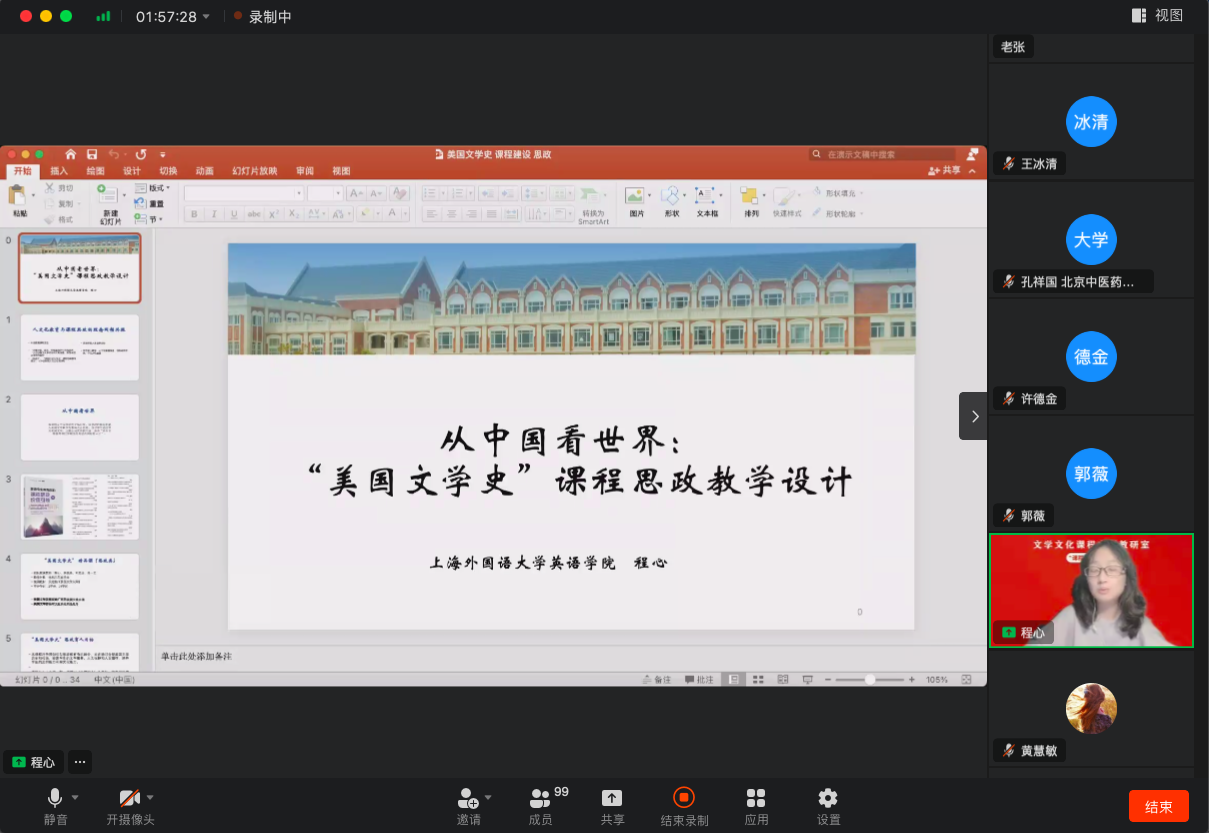 最后,程心副教授分享了“从中国看世界:《美国文学史》课程思政教学设计”。她指出,引导学生通过学习美国文学,正确认识世界和中国,由此培养出具有全球视野和全球眼光的高层次国际化人才。在贯彻思政教育的价值引领时,要突出中美文学交流与比较,凸显中外文化差异性和共性,让学生批判认识美国历史和文化,从而接受积极正面的价值。