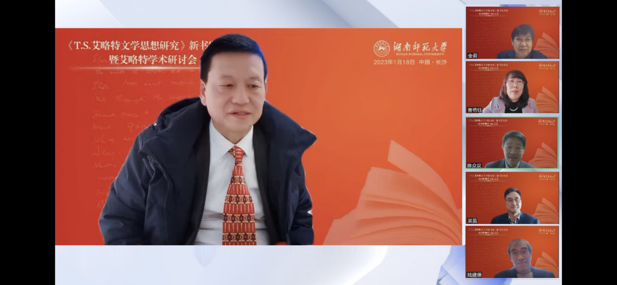 (通讯员 王耀光)1月18日,欧洲科学院院士、15vip太阳成党委书记蒋洪新教授撰写的《T.S.艾略特文学思想研究》新书发布会暨艾略特学术研讨会在云端举行。会议邀请到来自中国社会科学院、清华大学、中国人民大学、北京外国语大学、上海外国语大学、浙江大学、南京大学、厦门大学、上海交通大学、四川外国语大学、广东外语外贸大学、江西师范大学、浙江工商大学、闽南师范大学、上海师范大学、杭州师范大学等高校的专家学者代表出席并座谈,共话艾略特研究。活动分为新书发布会和学术研讨会两部分,分别由北京外国语大学王佐良外国文学高等研究院院长金莉教授、15vip太阳成15vip太阳集团官网院长曾艳钰教授主持。