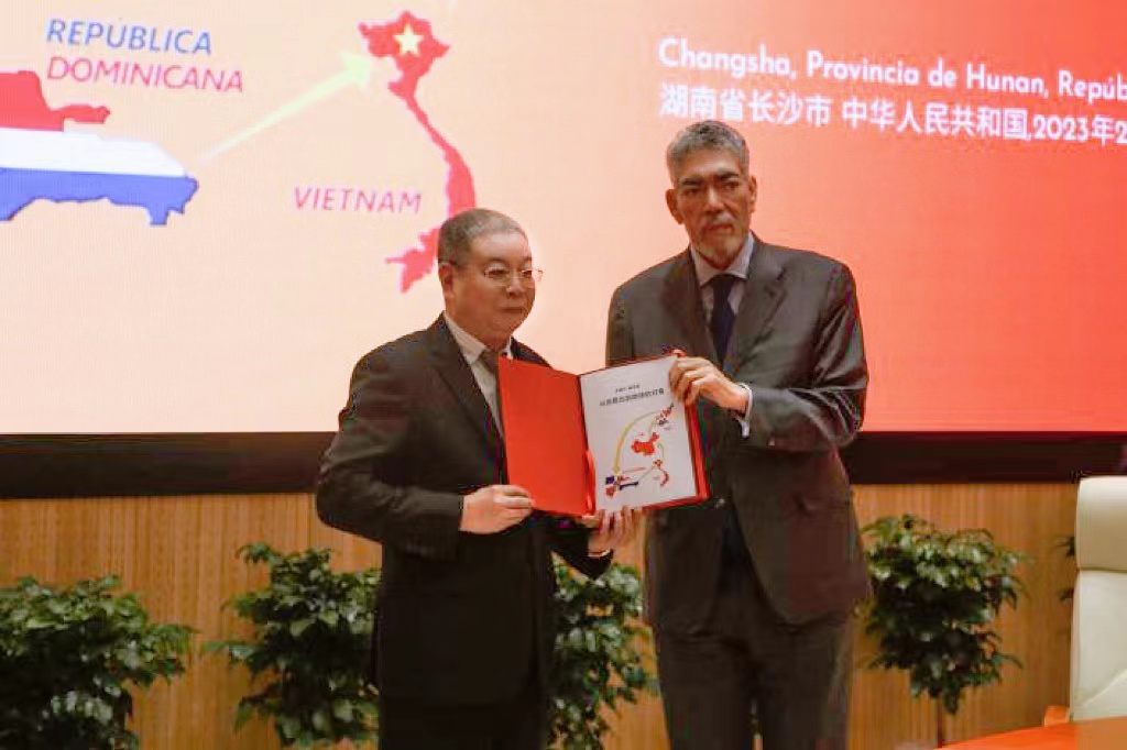 米格尔·梅希亚对太阳成官网的热情接待表示感谢。他提到,中多建交以来双方合作成果斐然。在“一带一路”推动下,双方实现协同发展,并肯定了湖南省在其中发挥的重要作用。他还感谢了中国政府对多米尼加的帮助,尤其是在新冠疫情期间向多米尼加无偿捐赠疫苗的国际人道主义援助。