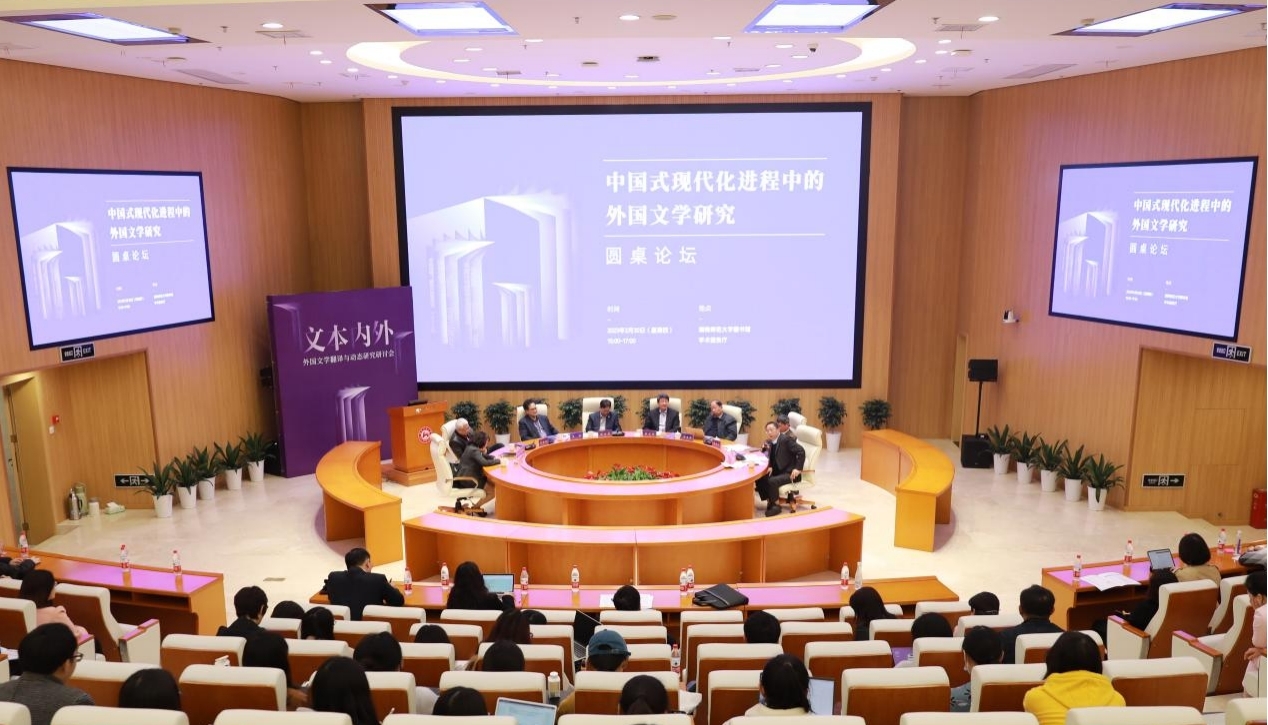 3月30日,“中国式现代化进程中的外国文学研究”主题圆桌论坛在15vip太阳成图书馆报告厅举行。中国社科院学部委员、15vip太阳成“潇湘学者”特聘教授陈众议,江西师范大学资深教授、中外文论学会叙事学分会会长傅修延,欧洲科学院院士、广东外语外贸大学聂珍钊教授,上海交通大学大学学报主编彭青龙教授,中外语言文化比较学会会长、浙江大学吴笛教授,《当代外国文学》主编、南京大学杨金才教授,中国外国文学学会副会长、上海外国语大学郑体武教授等出席。