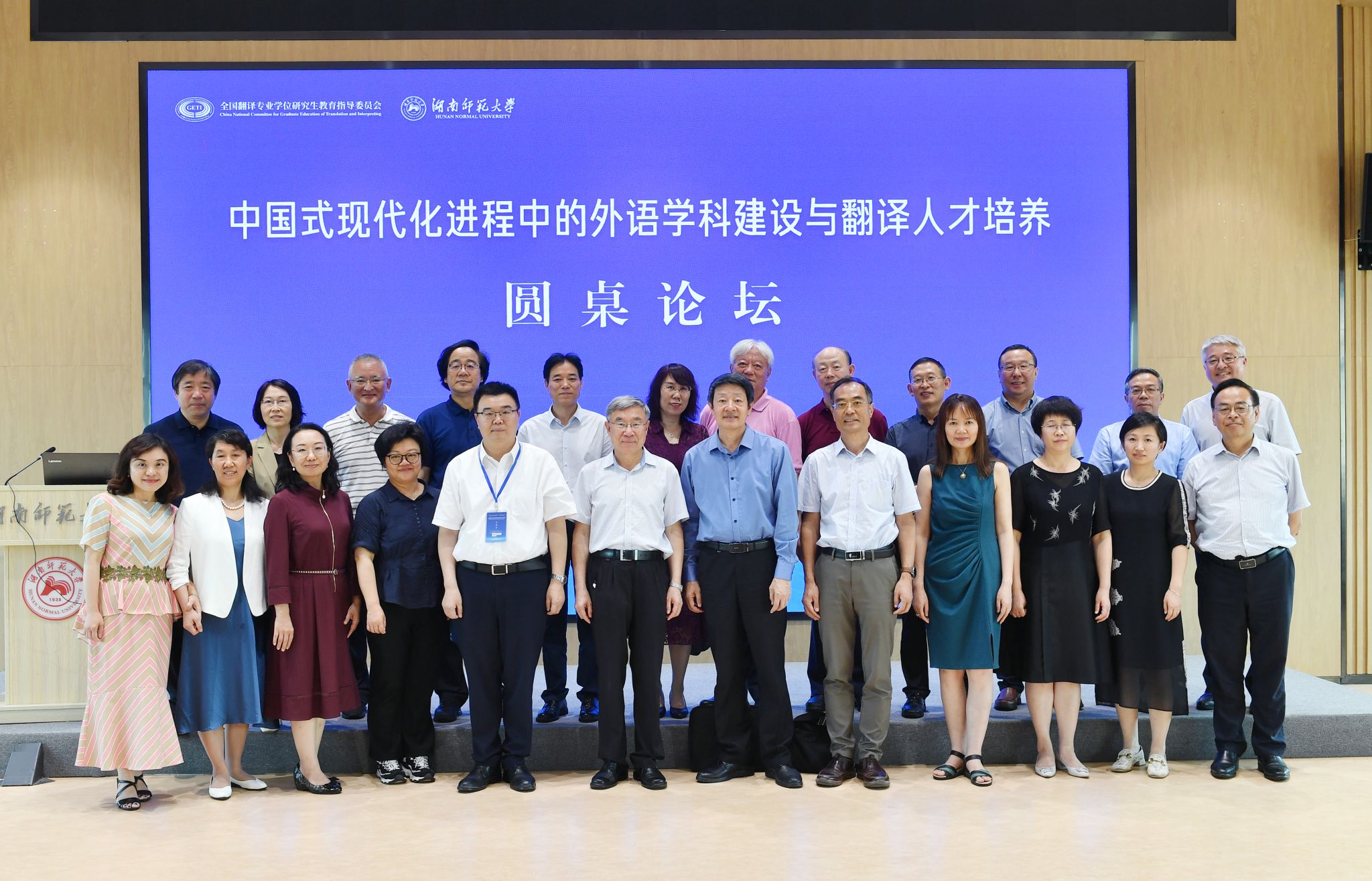 (通讯员 马小雪 童雨莎)6月9日下午,“中国式现代化进程中的外语学科建设和翻译人才培养”圆桌论坛在太阳成官网腾龙楼613报告厅举行。中国翻译协会常务副会长、全国翻译专业学位研究生教育专家委员会主任、中国外文局原副局长兼总编辑黄友义,15vip太阳成“潇湘学者”特聘教授、中国社会科学院学部委员陈众议,四川外国语大学校长、中国翻译协会常务副会长董洪川,北京外国语大学高级翻译学院院长、全国翻译专业学位研究生教育指导委员会副主任委员任文,广东外语外贸大学翻译学研究中心主任、全国翻译专业学位研究生教育指导委员会副主任委员赵军峰,上海外国语大学高级翻译学院院长、全国翻译专业学位研究生教育指导委员会秘书长张爱玲等出席论坛。论坛由副院长蒋莉华主持。