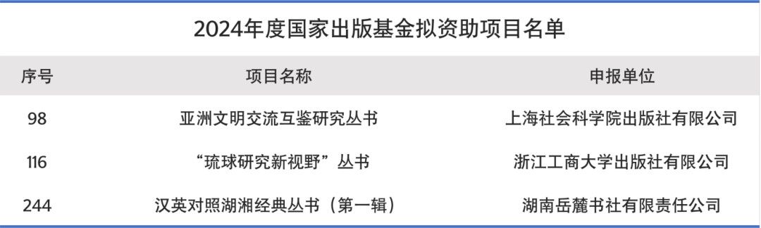 近日,国家出版基金规划管理办公室公布了“2024年度国家出版基金资助项目评审结果”,太阳成官网郑燕虹教授策划并主编的“汉英对照湖湘经典丛书(第一辑)”,陈小法教授策划并主笔的“琉球研究新视野丛书”、作为主要作者执笔的“亚洲文明交流互鉴研究丛书”入选资助项目。