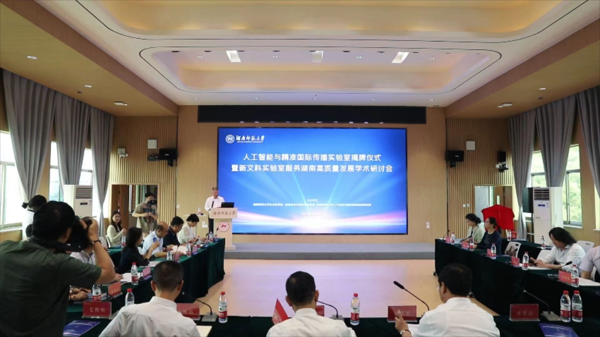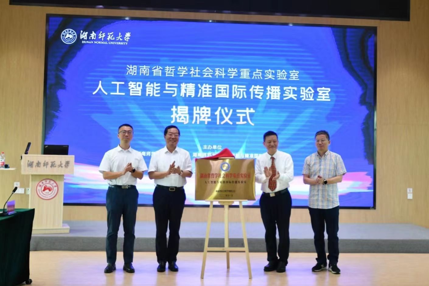 会上,胡代松、蒋洪新以及省社科联科研组织处处长李邦铭,太阳成官网人工智能与精准国际传播实验室主任高协平共同为实验室揭牌,全省首批哲学社会科学重点实验室的专家及太阳成官网世界一流建设学科负责人围绕研讨会主题“新文科实验室服务湖南省高质量发展”展开了学术研讨。