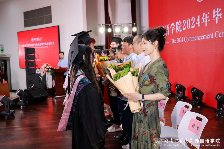 毕业生代表向参加典礼的教师代表献花,表达了对恩师孜孜不倦、仁爱精勤的教诲的深深感恩之情。