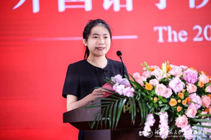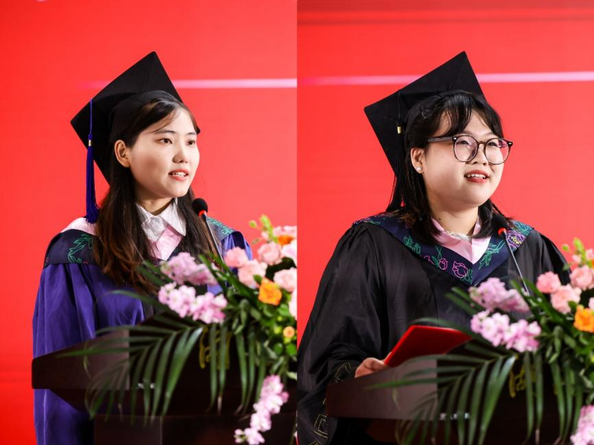 2020级英语专业本科生史丹丹、2021级英语语言文学方向硕士研究生朱素珍作为毕业生代表先后发言。她们回忆了自己在学院的求学和成长经历,表达了对学院、学校和老师深深的谢意与感激之情。