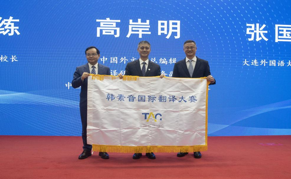 颁奖典礼后举行赛期交接仪式,副校长潘安练上台将赛旗交还给中国外文局总编辑高岸明,下届赛事承办单位大连外国语大学张国强副校长接过赛旗,顺利完成交接,标志着大赛的传承与延续。