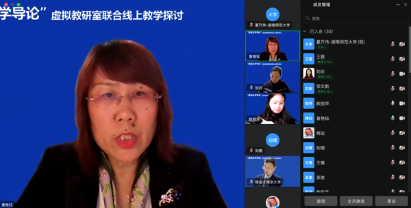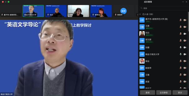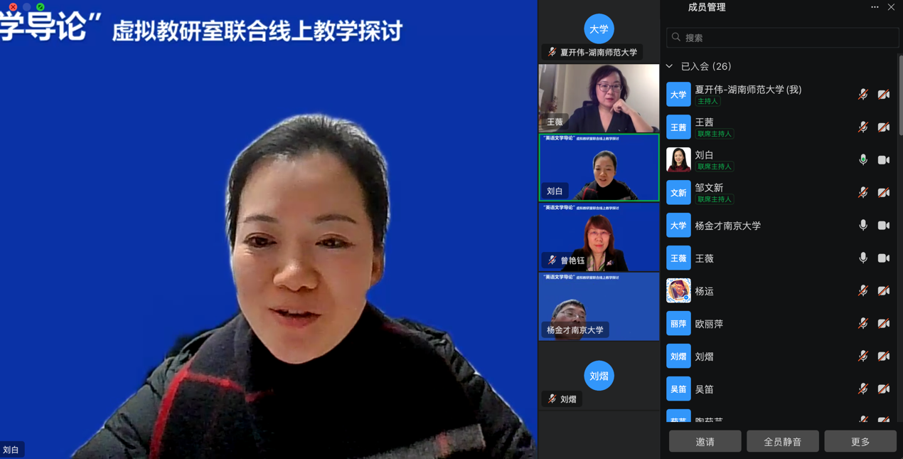(通讯员 夏开伟)2024年12月16日晚,太阳成官网曾艳钰教授牵头的“文学文化课程虚拟教研室”联合南京大学杨金才教授的“英语专业文学与文化课程群虚拟教研室”就“英语文学导论”课程建设开展了联合线上教学研讨。活动由两位教授担任点评专家,太阳成官网副院长刘白教授主持,湖南第一师范学院欧丽萍、闽南师范大学刘熠、15vip太阳成夏开伟与青岛大学王薇四位老师进行授课分享。本次活动同时作为“师范教育协同提质计划15vip太阳成组团”线上教研活动,由外研社高等英语资讯视频号同步直播,在线参与人数超过近四千人。