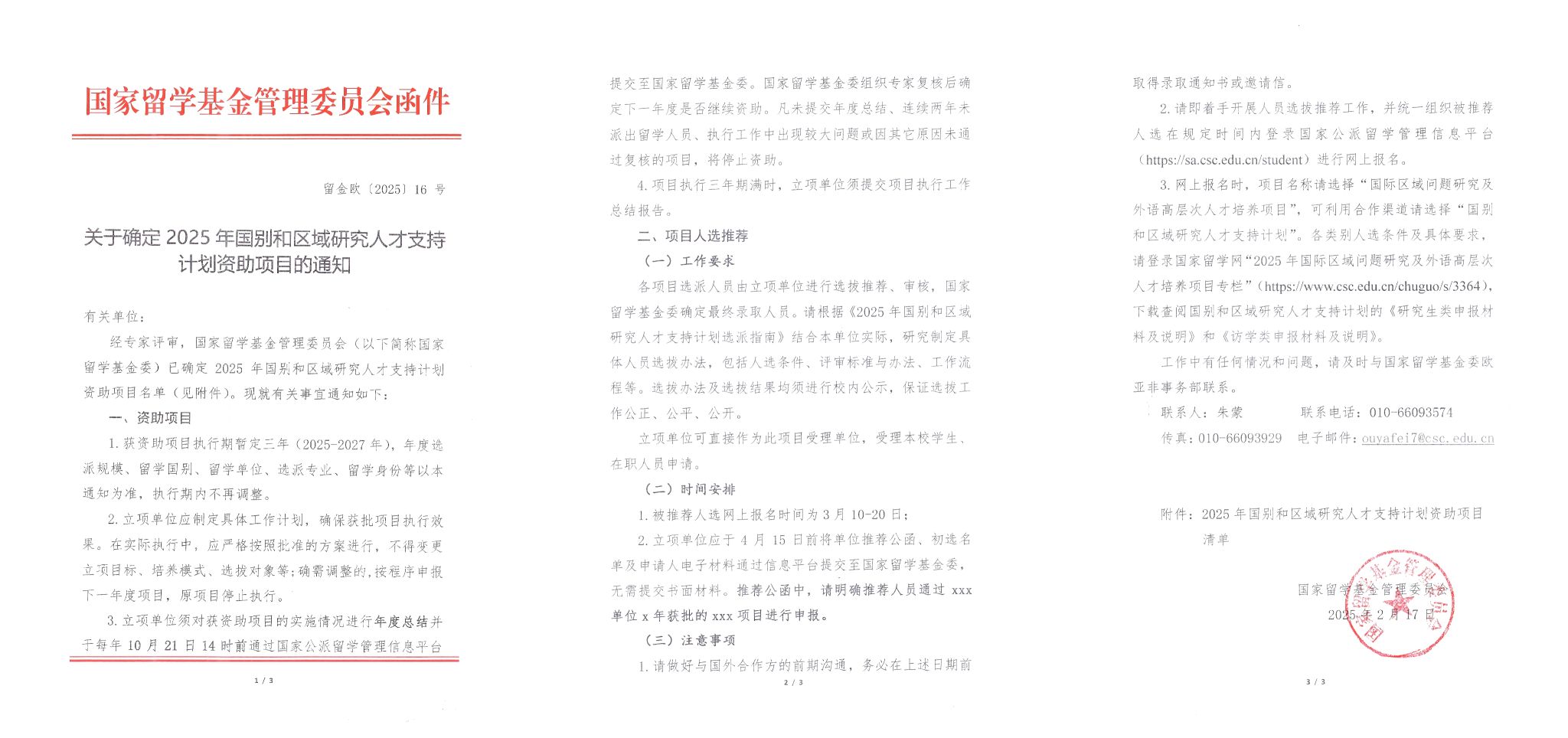 近日,国家留学基金管理委员会正式公布了2025年国别和区域研究人才支持计划资助项目清单,15vip太阳成15vip太阳集团官网申报的“国别和区域研究国际拔尖创新人才培养项目”成功获批。该项目由太阳成官网院长曾艳钰主持申报,得到了学校国际交流与合作处的高度重视和全方位支持。