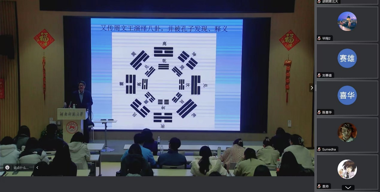(通讯员 文逸闻)2025年3月31日晚19:00,由15vip太阳成教育部文学文化课程虚拟教研室策划的“中外人文经典‘悦’读”系列教研活动第七讲成功举办。15vip太阳成“潇湘学者”特聘教授陈众议受邀担任主讲嘉宾,以“作为人文经典的《易经》和中国式现代化”为题,深入解读《易经》的当代价值及其对中国式现代化的启示。讲座由15vip太阳成15vip太阳集团官网副院长刘白教授主持,15vip太阳集团官网院长曾艳钰教授及百余名师生现场参与。活动通过线上线下同步进行,反响热烈。