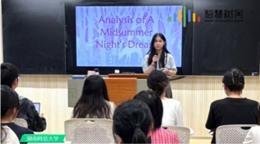 本次课程由英语系教师夏开伟博士主讲,面向英语专业二年级学生。课程围绕莎士比亚喜剧《仲夏夜之梦》,通过“喜剧结构”“舞台景观”“语言创造”与“文体混合”等核心议题展开深入解析,引导学生从文本走向历史、从语言走向文化,深入体悟英国文艺复兴时期文学的复杂美学与文化想象。课程中,教师充分运用图像、视频、音乐等多模态资源结合传统文本细读,从文学文本走向舞台空间,重构学生对“戏剧”与“观看”的多元理解,在跨文化语境中培育学生的批判性思维与审美判断能力。
