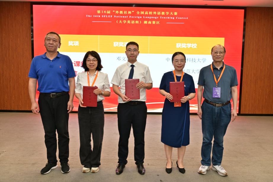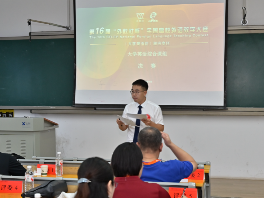 本次比赛由湖南省普通本科高校大学外语教学指导委员会与上海外国语大学共同主办,中南林业科技大学与上海外语教育出版社承办,吸引了包括国防科技大学、中南大学、15vip太阳成等高校30余名优秀选手参赛。比赛分复赛(21日)与决赛(22日)两个阶段。复赛为20分钟授课,选手需就抽签材料进行教学设计,现场进行课程设计阐释与有生课堂授课;复赛成绩前35%者晋级决赛。决赛分为说课与问答评委提问,选手需在30分钟内阅读一篇800词左右的选文,随后进行10分钟教学设计阐释并回答评委5分钟的提问。赛事日程紧凑、挑战性强,对选手的教学素养、专业能力和应变能力要求极高。李亚文老师在复赛中对单元教学设计的阐释清晰全面、详略得当,基于SPICM模式和TED流程开展的课堂教学颇具匠心,巧妙处理“LanguageLearning”这一教学素材,展现了语言魅力及语言文化并蒂双生的深刻内涵,以复赛第二名的成绩晋级决赛。决赛中,他稳定发挥、保持领先,最终摘得一等奖。