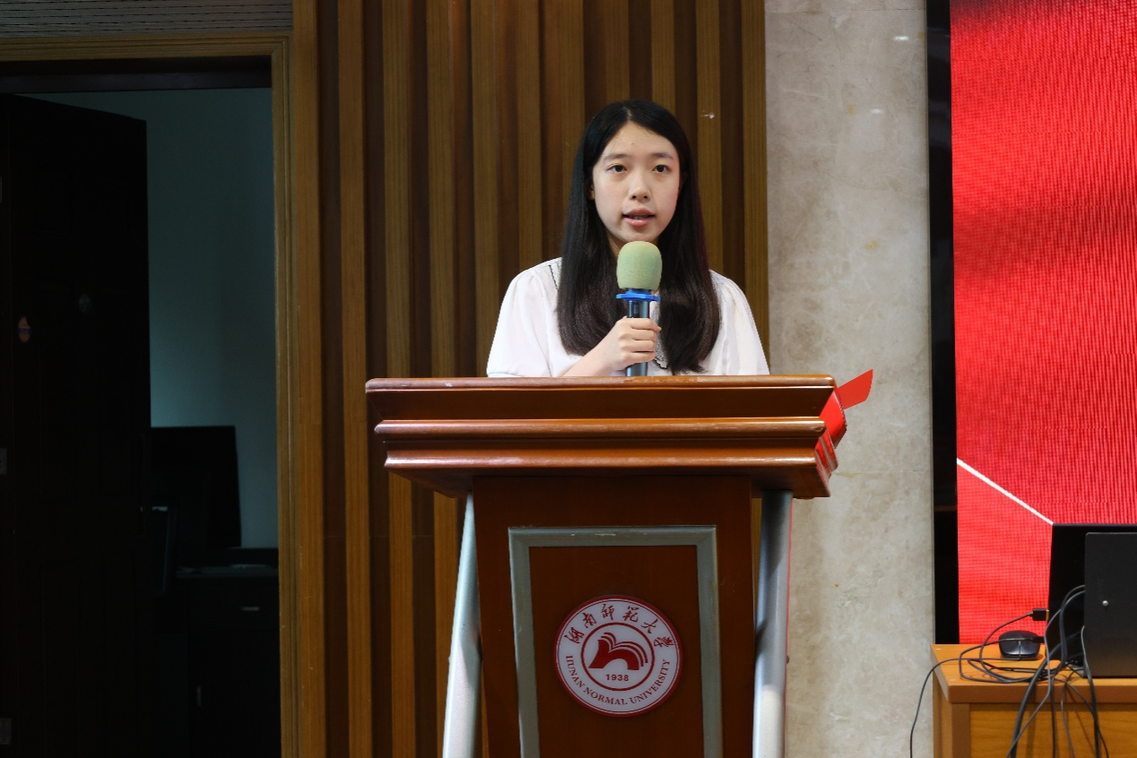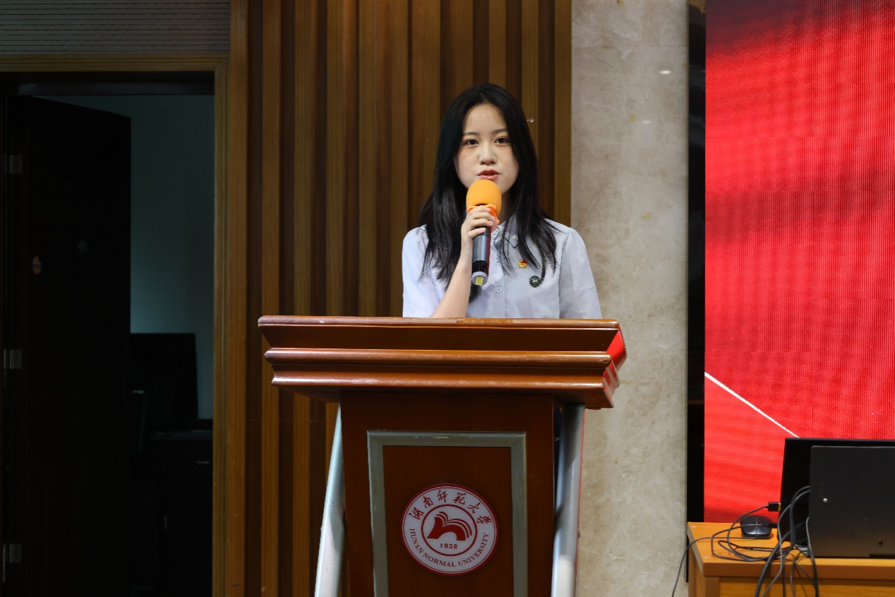 2024年暑期社会实践活动成员代表黄乐妍发言,她以责任、热爱、合作为核心,分享了三下乡实践中的成长感悟和实践经验。随后,2025年暑期社会实践活动成员代表刘亦安娜发言,鼓励新一届队员以饱满的热情投身社会实践活动。