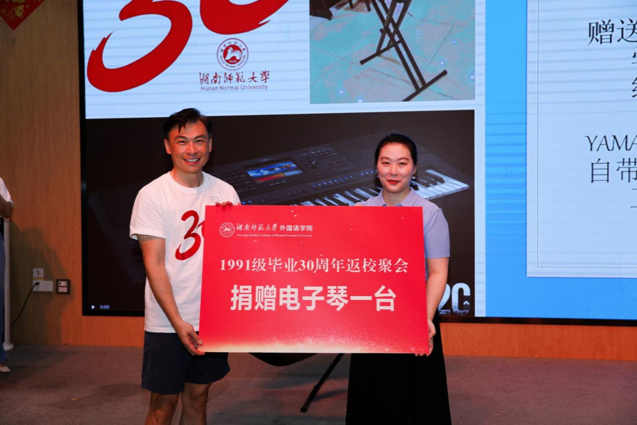 会上,1991级校友代表向学院捐赠电子琴一台,莫南代表学院接受捐赠。