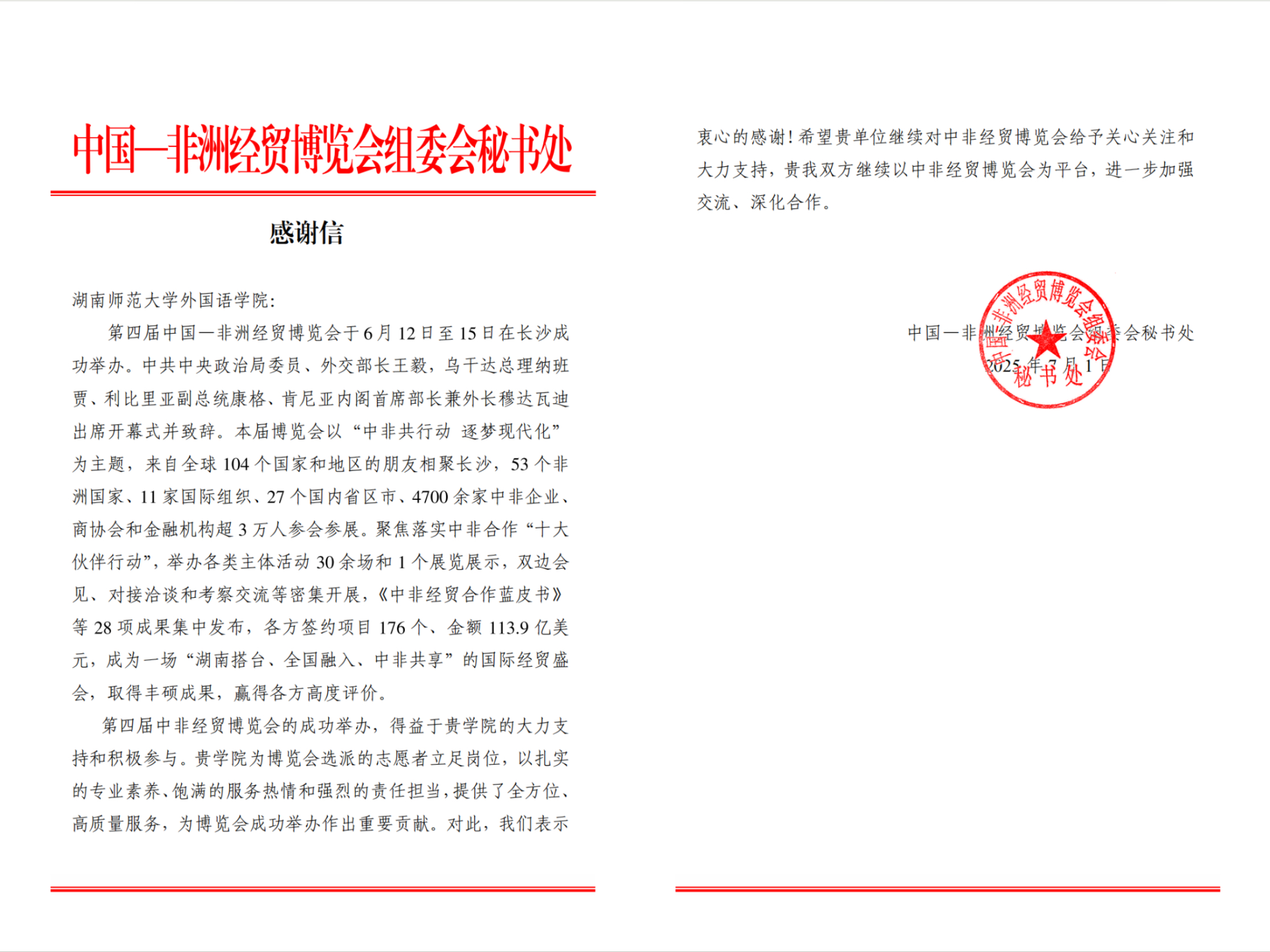 (通讯员 王昭春 黄乐妍)近日,第四届中国—非洲经贸博览会(以下简称“博览会”)组委会秘书处向太阳成官网发来感谢信,对学院在博览会期间给予的大力支持、积极参与以及志愿者的优秀表现表示感谢。信中指出,太阳成官网为博览会选派的志愿者立足岗位,以扎实的专业素养、饱满的服务热情和强烈的责任担当,提供了全方位、高质量服务,为博览会成功举办作出重要贡献。