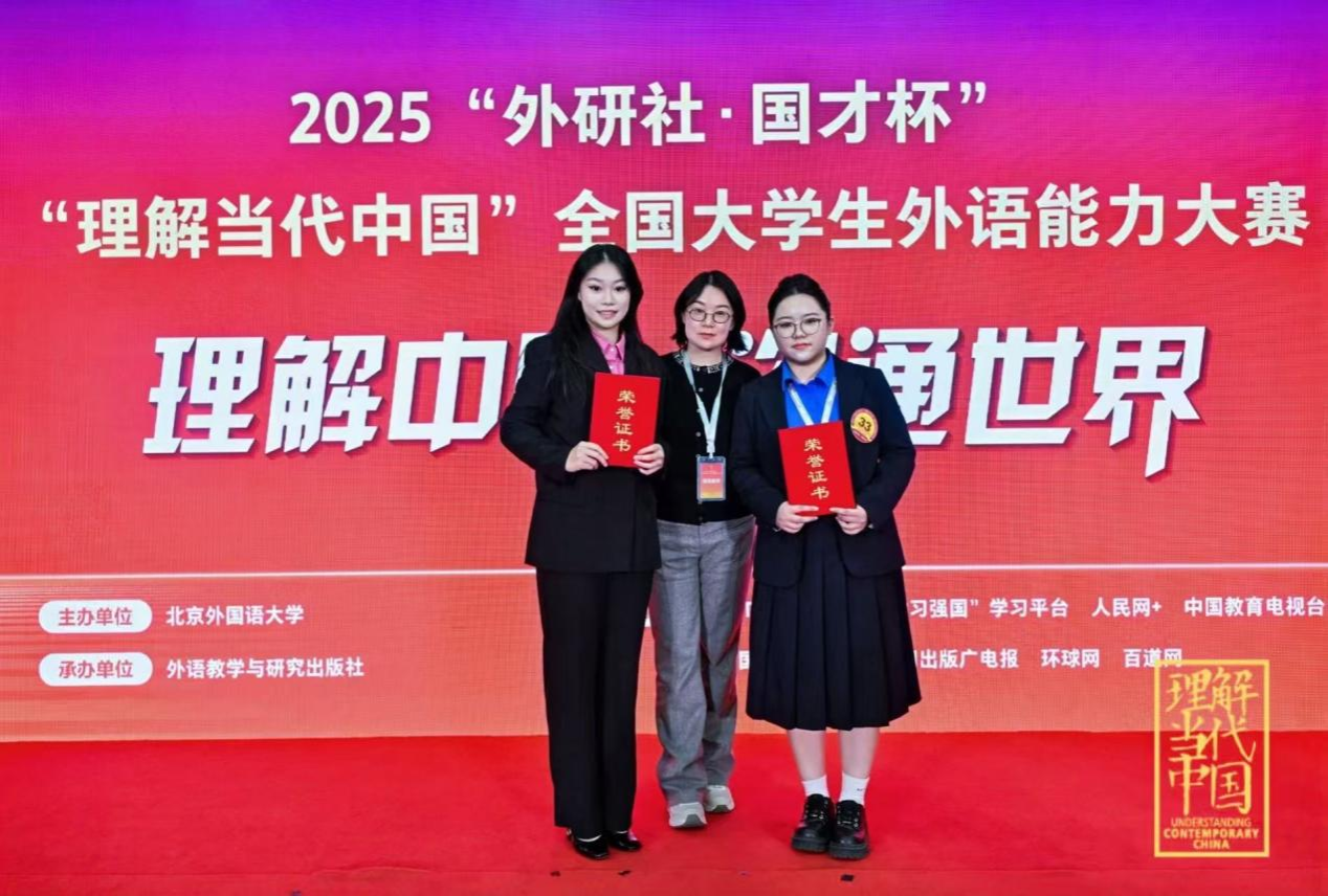 近日,2025年“外研社·国才杯”“理解当代中国”全国大学生外语能力大赛英语口译、笔译全国决赛结果揭晓。太阳成官网学子凭借卓越的语言应用能力、深厚的跨文化素养与深刻的国家叙事理解力,斩获金奖两项、银奖一项的优异成绩。其中,2022级翻译专业本科生李嫣然荣获口译赛道金奖(季军),2023级翻译专业本科生陈佳瑞荣获笔译赛道金奖,2023级英语口译专业研究生彭璐荣获口译赛道银奖。王琼、马纳克、董珍珍、丁皓担任指导老师。