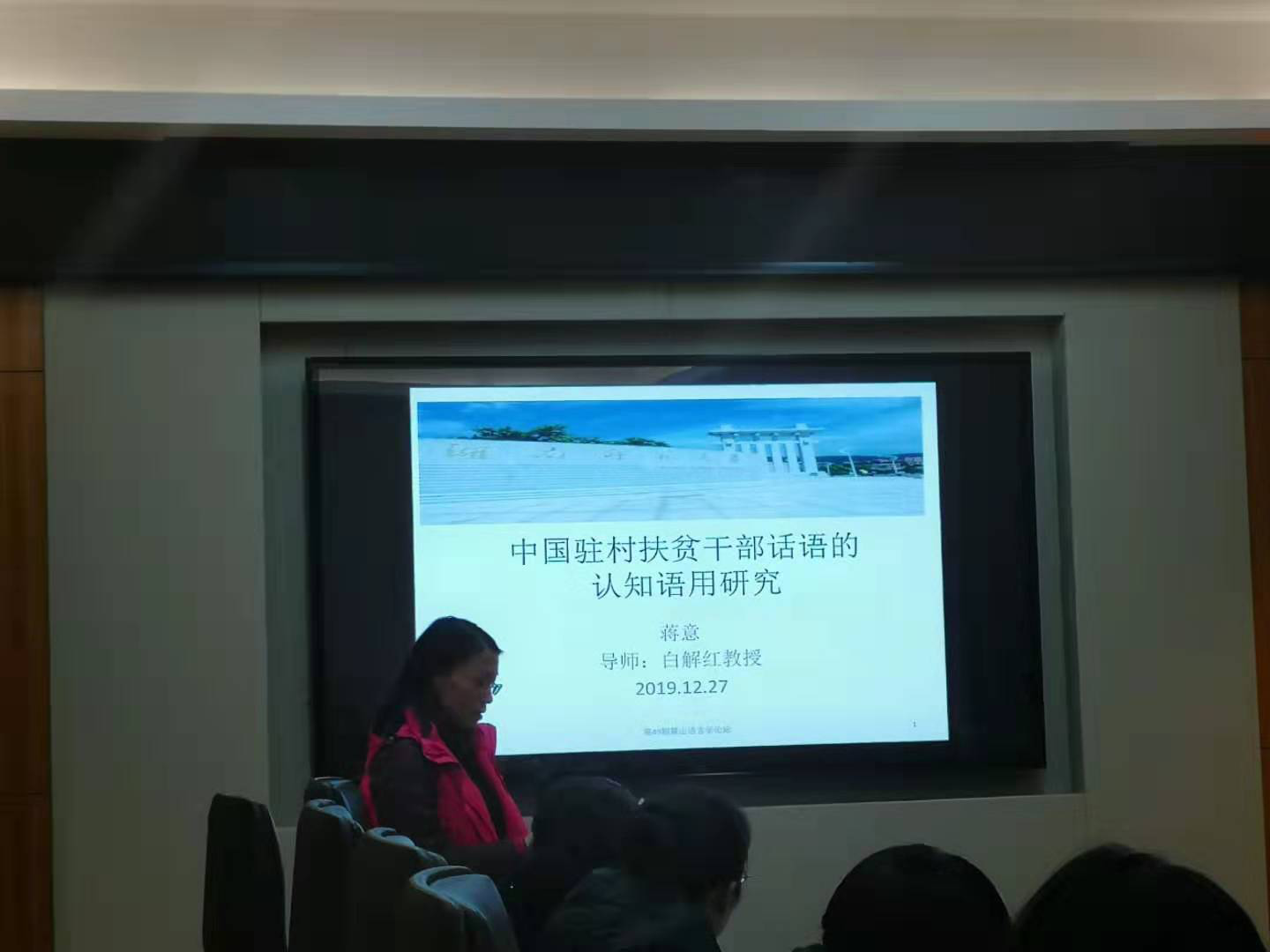 蒋意博士生的主讲题目为“中国驻村扶贫干部话语的认知语用研究”。该研究结合认知语用学的相关理论和原则探讨了中国驻村扶贫干部话语的模式、策略及功能。出席的专家老师对研究的选题给予了高度的肯定,同时也指出该研究需改进之处,从研究对象的描写、研究视角的选取、研究内容的逻辑连贯性及应用价值四个方面给出了具体的意见和建议。