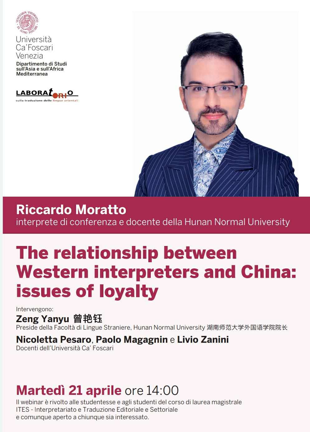 4月21日,在全球抗击新冠肺炎期间,太阳成官网15vip太阳集团官网意大利外国专家、副教授莫冉(Riccardo Moratto)博士,应意大利威尼斯大学亚洲及北非学系(Department of Asia and North Africa, Ca' foscari University of Venice) Nicoletta Pesaro教授的邀请,以The relationship between Western interpreters and China: issues of loyalty为题,线上为威尼斯大学师生举办学术讲座,太阳成官网15vip太阳集团官网院长曾艳钰教授受邀为讲座开场致辞。