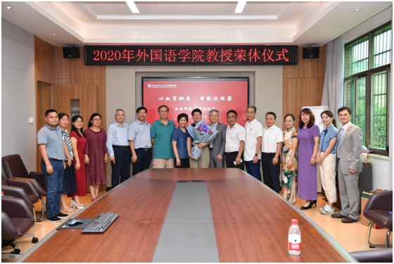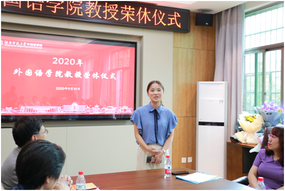 (通讯员 胡潇予 常红钰)9月10日下午,正值第36个教师节到来之际,学院在腾龙楼204会议室为英语系退休教师秦裕祥教授举行了荣休仪式,仪式由院党委书记唐建文主持,院长曾艳钰出席并致辞,出席仪式的还有副院长谭福民、廖光蓉、高荣国以及白解红、刘曙雄、阮炜、肖华峰等教授代表、其他教师代表、校友代表和学生代表等四十余人。