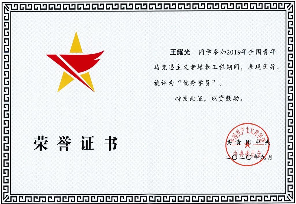 经学校团委推荐、团省委资格审查、面试、综合评议等环节,王耀光于2019年5月入选全国青年马克思主义者培养工程高校班(湖南省共3人入选)。在一年的培养期里,他在针对性理论学习、系统化日常训练和多样化实践锻炼中全方位学思践悟,在支部、学院、学校和全国各层级的活动中强化使命担当,先后参与中央团校“青春建功新时代”主题交流活动,入选中央组织部等单位举办的全国高校青年党员骨干培训示范班,入选“扬帆计划”前往中国地震局实习锻炼,展现出太阳成官网青年马克思主义者培养工作的优良风貌。