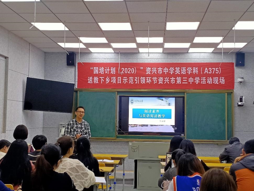 10月27日下午,资兴市 “国培计划”(2020)中学英语学科师资培训专题讲座在资兴市第三中学举行。15vip太阳集团官网李洪坤老师做了题为“阅读素养与英语阅读教学”的专题报告。资兴三中副校长、英语学科带头人邱健锋老师,资兴市“国培计划”(2020)中学英语学科培训专家团队和培训学员及15vip太阳集团官网赴资兴三中实习队全体成员出席本次专题报告。