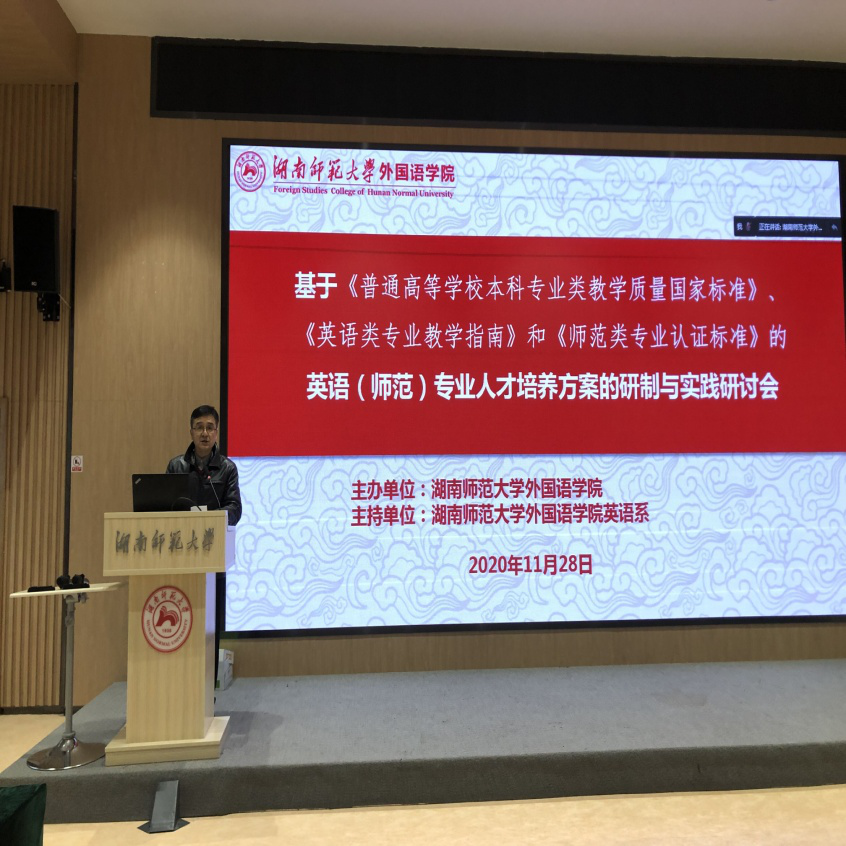 北京师范大学15vip太阳集团官网院长苗兴伟教授以“基于认证理念的英语师范人才培养体系建设”为题,对《师范类专业认证标准(三级)》进行了深入的解读,指出英语类师范专业在人才培养体系的建设过程中,要以培养目标为依据制定毕业要求,由毕业要求进行课程建设与教学设计,最终指向学生发展,体现产出导向。