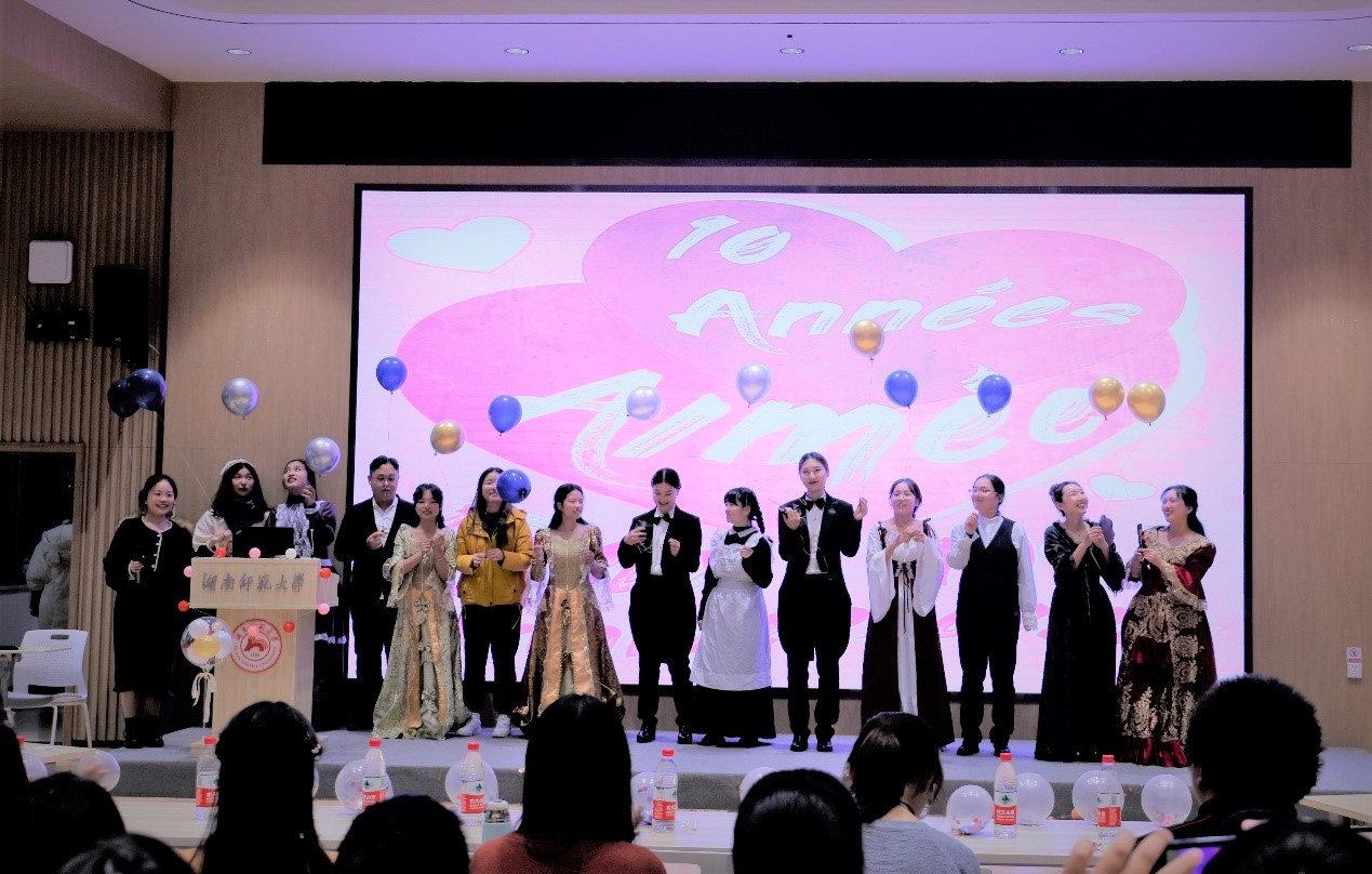 活动过程中,法语系师生同台表演,气氛热烈。方丽平、2018级法语班学生吴傲、叶晓璇带来开场舞《Yes ok!》,青春洋溢,气氛活跃;张弛用中法双语朗诵他为法语系十周年作的诗歌《法语系十周年庆有感》,感情真挚,内涵丰富;随后,法语系外教M.Leleu带来趣味演讲《Pourquoi apprendre le français?》,向大家展示了法语的实用性与重要性;吴泓渺带来脱口秀表演《L’homme de couleurs 》,批判了种族主义思想,呼吁文化间需要理解和接纳。法语系学生进行歌曲、法语短剧配音及诗朗诵等节目表演,其中2019级法语班部分同学以戏剧形式表演了法国著名作家莫泊桑的作品 《项链》(《La parure》),演员们配合默契,灵动地展现了原剧中人物的情感变化及剧中的深刻内涵,引人深思。
