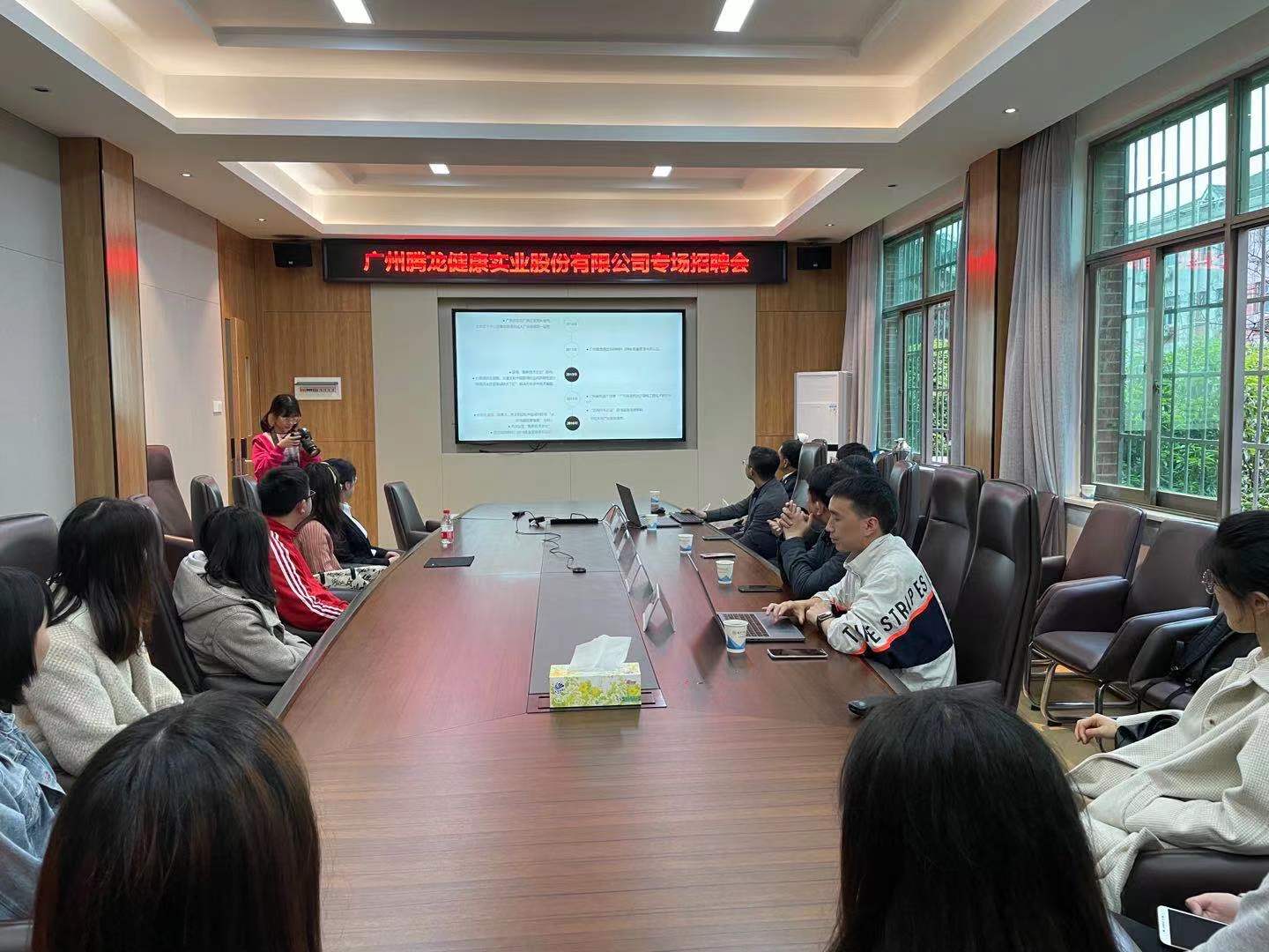 专题讲座后,学院于204会议室开展广州腾龙健康实业股份有限公司专场招聘会。彭学文及公司骨干成员向同学们介绍了公司的基本情况,面试了参加招聘的同学。