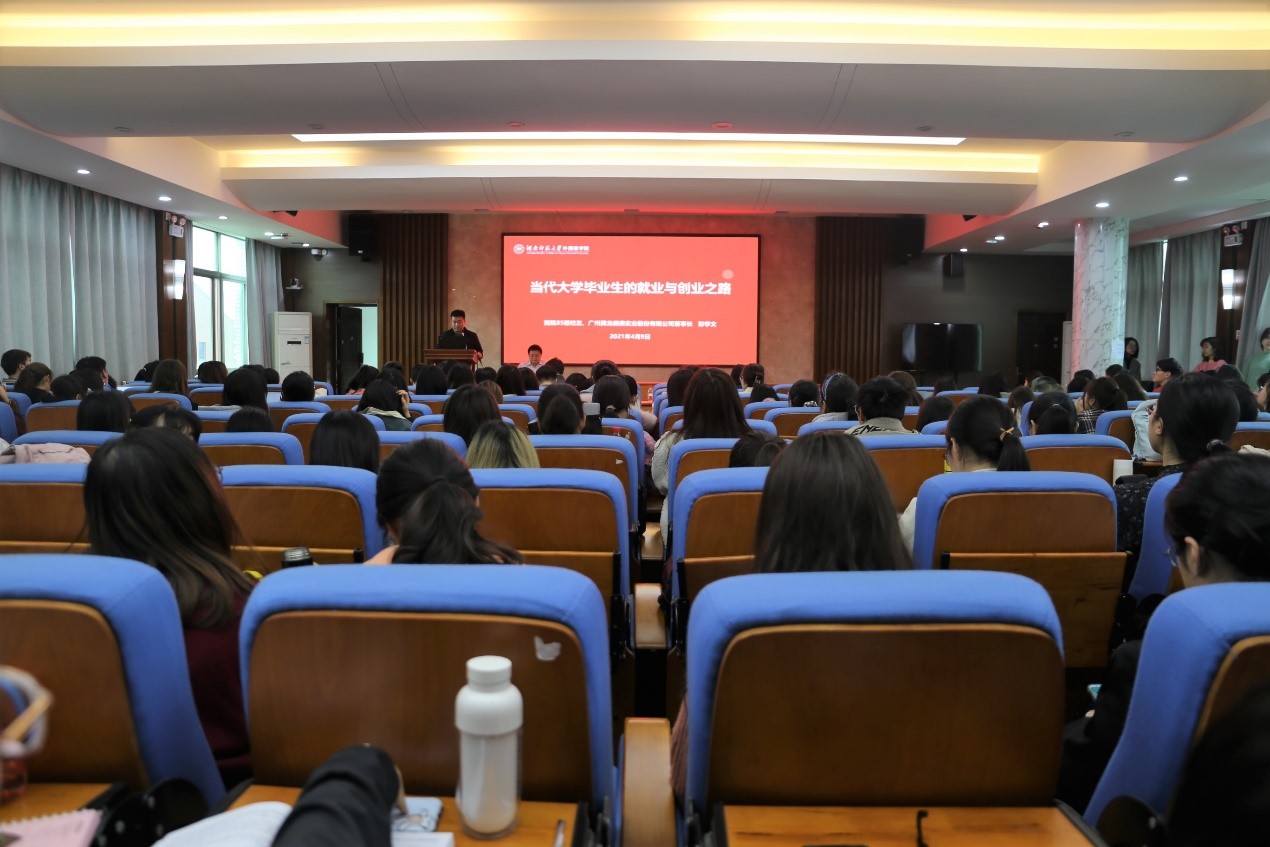 彭学文以提问引入,为同学们讲解了当代大学毕业生的现状和亟待解决的问题。他用富有哲思的比喻为同学们阐述了人生中就业与创业的关系,他将人生比作翻越一座山,在上山的过程中:一是需要“找食物”,即找工作,用劳动换回需要的物质;二是需要“看风景”,即让自己保持良好的心态;三是“找宝藏”,即通过创业的方式获得财富。
