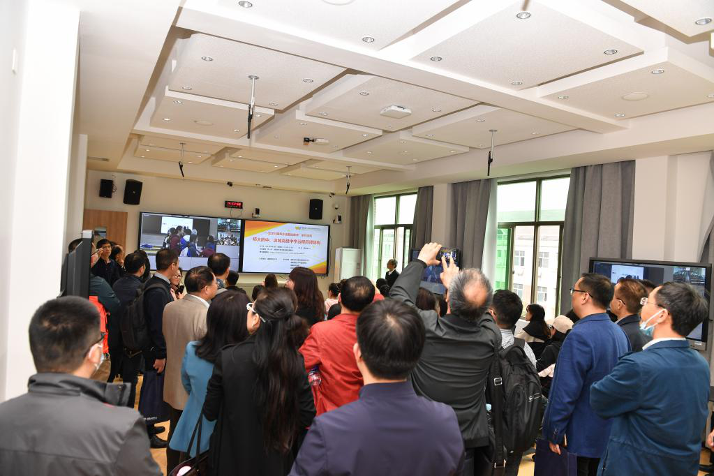 在学院智慧教室,湖南师大附中与边城高级中学通过远程进行同课异构,与会嘉宾观看了学院“一流学科服务外语基础教育”远程教研指导活动,了解15vip太阳成“乡村外语教育实践基地”服务乡村教育振兴的情况。在虚拟仿真实验室,与会嘉宾观摩了国家级虚拟仿真实验教学一流课程“‘一带一路’背景下跨文化障碍语言交际虚拟仿真实验”的教学情况,体验了实验室VR设备的场景教学。