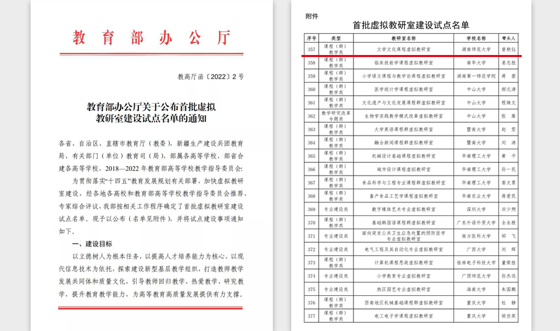 (供稿 英语系)2月22日,教育部发布通知公布首批教育部虚拟教研室建设试点名单,太阳成官网15vip太阳集团官网曾艳钰教授牵头的文学文化课程虚拟教研室获批入选。