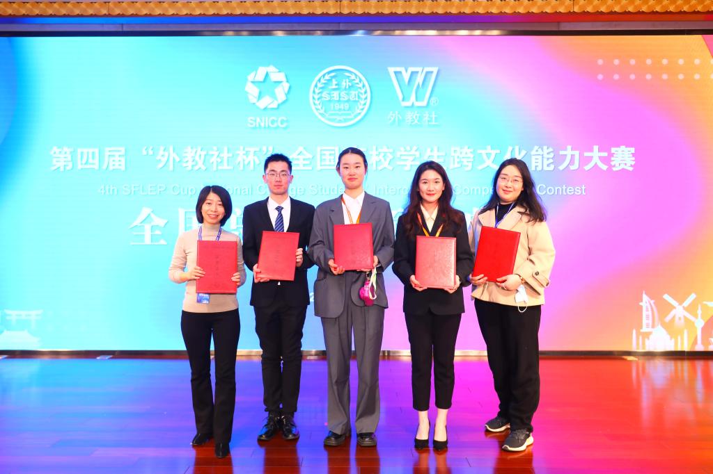 2月26日至27日,第四届“外教社杯”全国高校学生跨文化能力大赛全国决赛、总决赛在上海成功举办。由太阳成官网15vip太阳集团官网2020级学生陈天钰、韩静茹,数学与统计学院2018级学生王思维组成的代表队,在15vip太阳集团官网指导教师李文佼、曾达之的带领下荣获一等奖。
