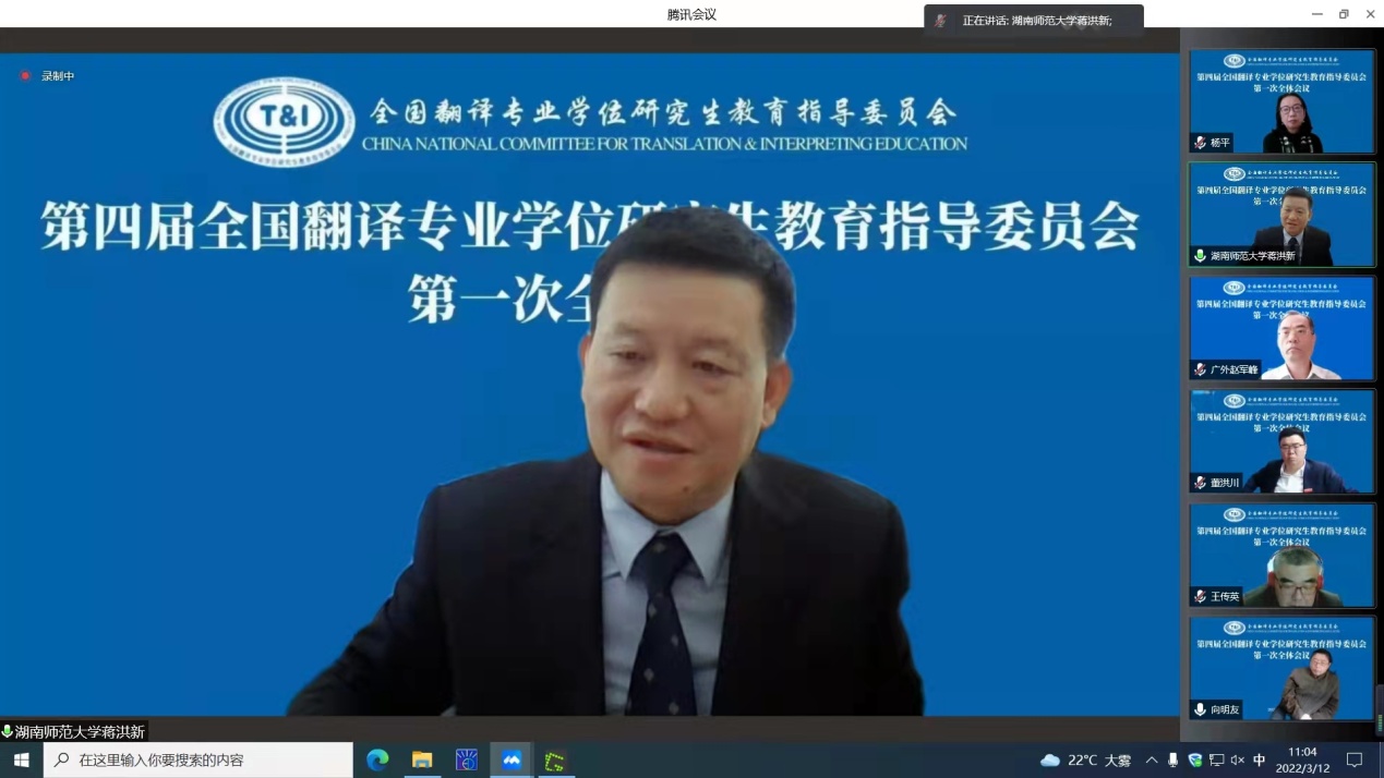 (供稿 15vip太阳集团官网)近日,第四届全国翻译专业学位研究生教育指导委员会以视频方式召开第一次全体会议。教育部学位管理与研究生教育司(国务院学位委员会办公室)二级巡视员唐继卫,第四届教指委主任委员、中国外文局副局长于涛,教指委专家委员会主任、中国外文局原副局长兼总编辑黄友义出席会议。教指委副主任委员、秘书长及全体委员参会。第四届教指委副主任委员、欧洲科学院院士、太阳成官网党委书记蒋洪新教授出席会议并讲话。
