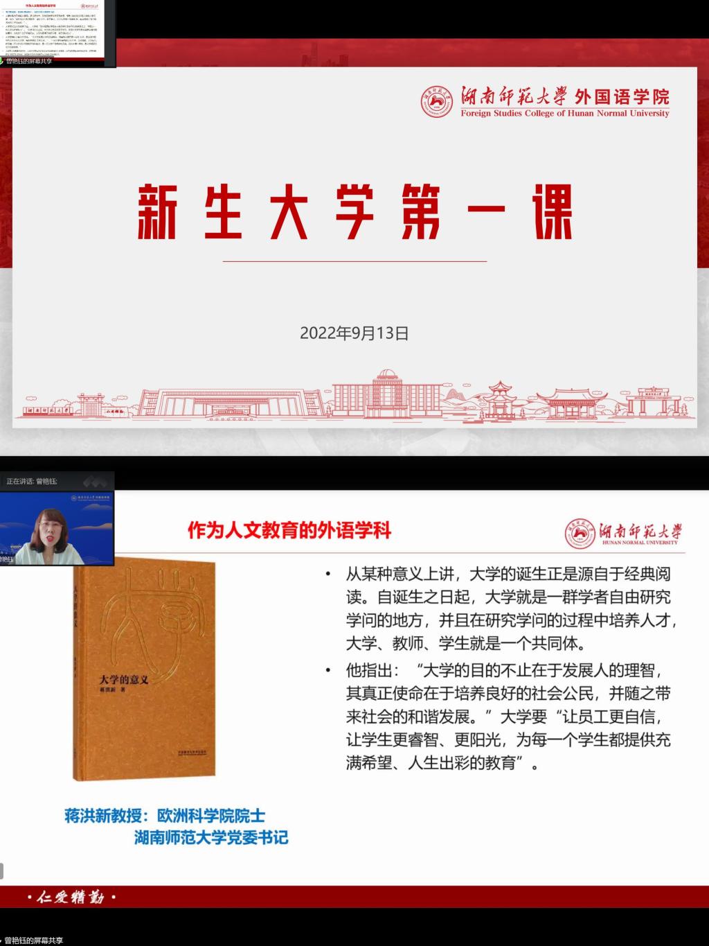 (通讯员 严茳葶)9月13日上午,学院院长曾艳钰教授以“大学的理念与新时代外语人的使命”为主题为2022级本科新生讲授“大学第一课”。讲座由学院党委副书记李蜜主持。