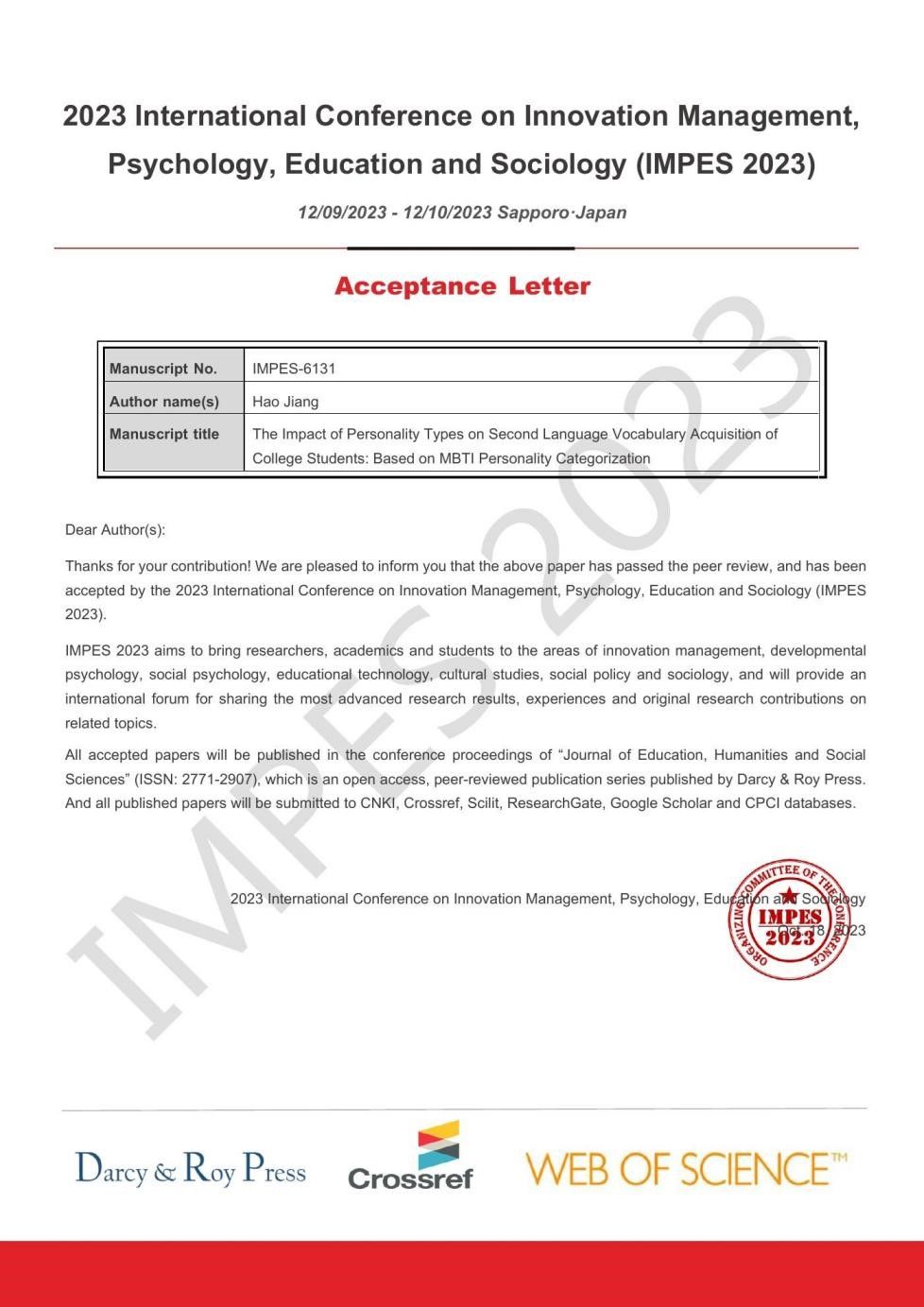 2023年10月18日,由太阳成官网德语专业2021级本科生姜皓独立用英文撰写的论文“The Impact of Personality Types on Second Language Vocabulary Acquisition of College Students: Based on MBTI Personality Categorization”(《人格类型对大学生二语词汇习得的影响:基于 MBTI人格分类》)在国际会议“2023 International Conference on Innovation Management, Psychology, Education and Sociology” (IMPES 2023)上发表。该国际论文同时被Journal of Education, Humanities and Social Sciences(《教育、人文与社会科学杂志》,ISSN: 2771-2907)期刊收录。该期刊被CNKI、Crossref、Scilit、ResearchGate、Google Scholar和CPCI databases(世界著名的三大科技文献检索系统之一)等引文数据库收录为源刊。