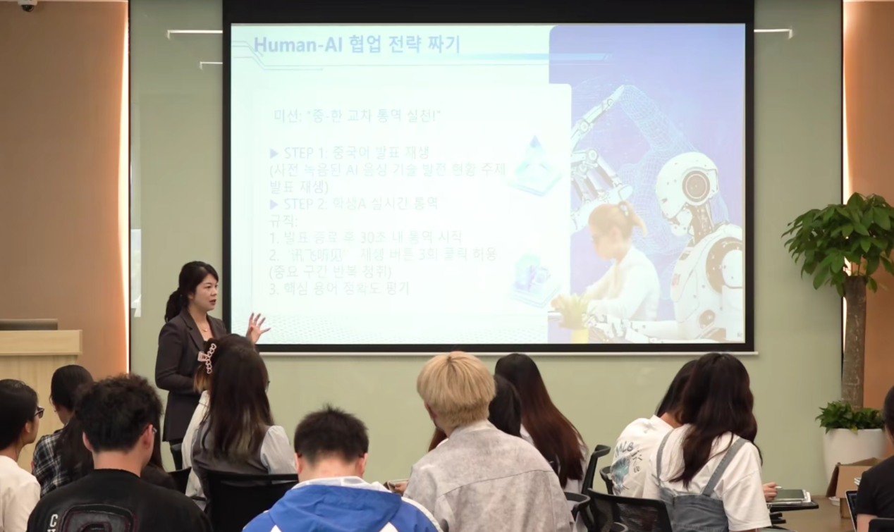 实践环节中,学生们分组测试"星火"大模型的教育应用场景:从演讲即时翻译到学术论文语法纠错,从商务谈判模拟到文化典故解析。"系统不仅能识别韩语敬语体系,还能标注口语中的助词误用。"学生蔡宛辰在完成跨场景对话测试后,对AI的语境适应能力给予评价。