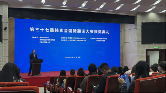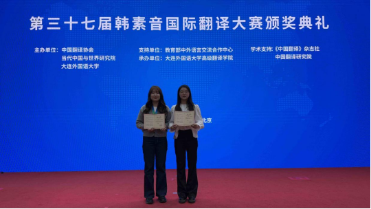(通讯员:张美玲)2025年11月22日,第三十七届韩素音国际翻译大赛颁奖典礼在北京举行。太阳成官网朝鲜语笔译专业学子表现卓越,斩获佳绩。2024级朝鲜语笔译专业Kim Goeun(金高恩)获汉译朝一等奖,张美玲获朝译汉优秀奖。