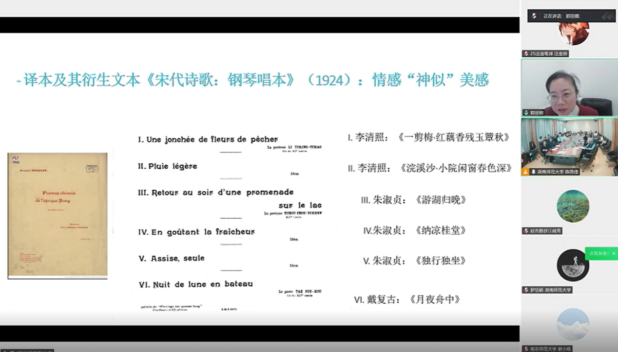 中山大学中文系郭丽娜教授的发言题目是《德•莫朗与中国宋代诗词在法国的艺术形制迁置》(George Soulié de Morant et Transposition d’art des poèmes Song en France)。她引用德•莫朗“翻译要把情感传递出去”的理念,结合法语文学作品的艺术形制变化与宋词实例,指出文艺作品中的情感能够跨越语言隔阂引起共鸣。