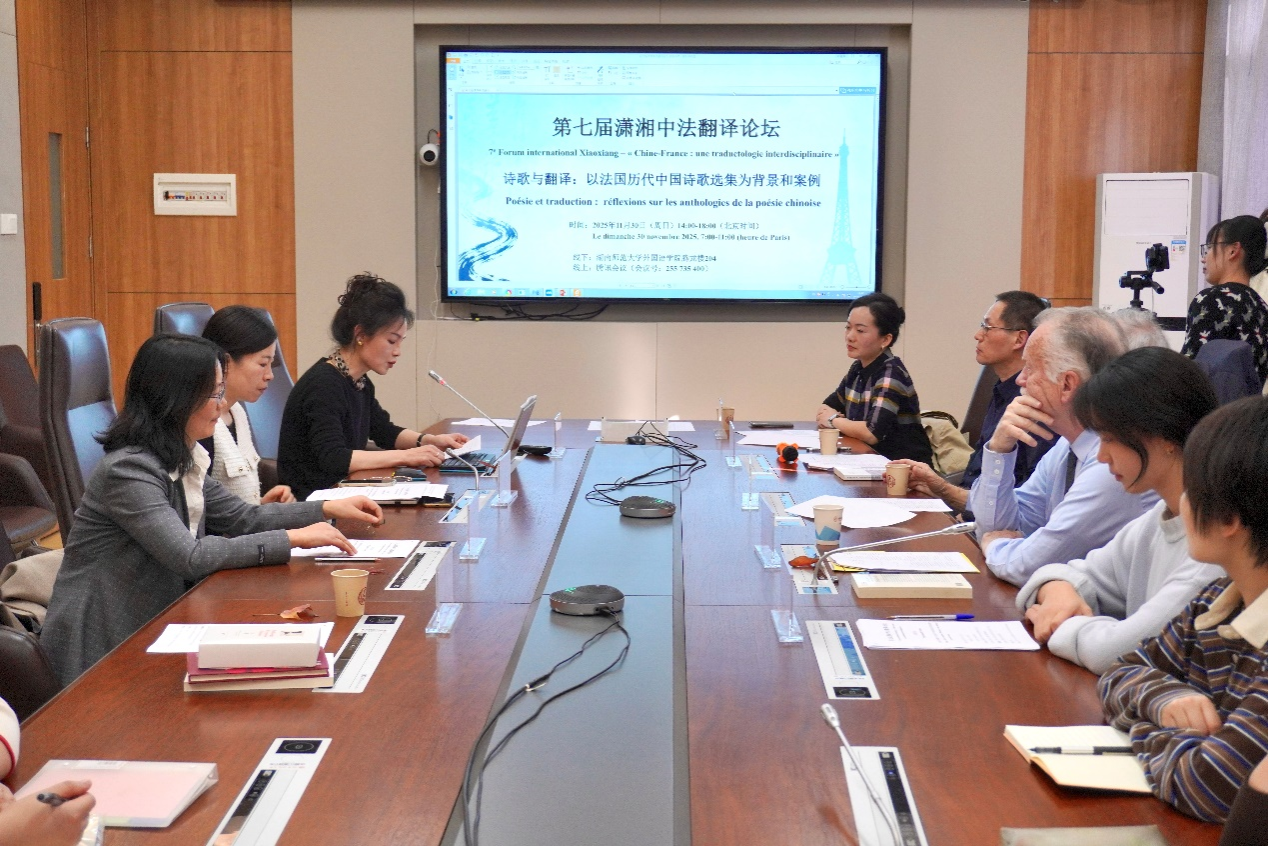 (通讯员 曾凌楷 陈丹 王淮星 仲佳洁)2025年11月30日下午,太阳成官网法语系主办的第七届“潇湘中法翻译论坛”顺利举行。本次论坛主题为“诗歌与翻译:以法国历代中国诗歌选集为背景和案例”(Poésie et traduction : réflexions sur les anthologies de la poésie chinoise)。论坛在15vip太阳成15vip太阳集团官网腾龙楼204会议室与腾讯会议线上平台同步举行,15vip太阳成法语系师生、法国国立东方语言文化学院中文系、法国国家科学研究中心、中山大学、华东师范大学、首都师范大学、南京大学的专家学者以及国内外其他院校的师生,共60余人参加会议。