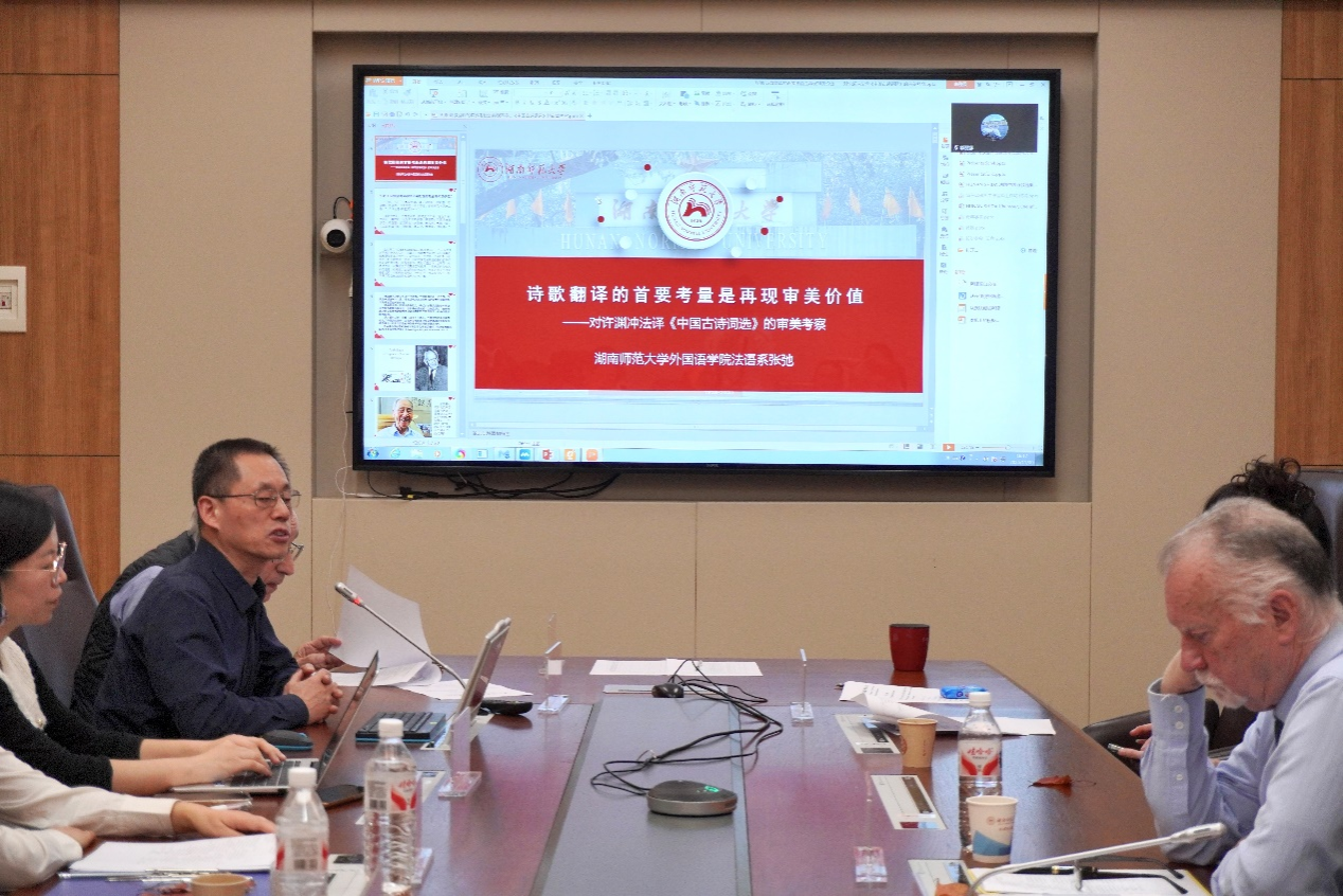 太阳成官网法语系学科带头人张弛教授做了题为《诗歌翻译的首要考量是再现审美价值——对许渊冲法译〈中国古诗词选〉的审美考察》(La considération principale de la traduction de la poésie est de reproduire la valeur esthétique – Une investigation esthétique de l’Anthologie des Poèmes Chinois Classiquesde Xu Yuanchong)的发言。他指出在当代社会,我们更需要重视文学的审美功能,要加强文学素养与审美能力,以对抗“语言粗鄙化”与“诗歌口水化”。他强调在诗歌翻译中也必须注重原诗的审美价值,努力重现原诗的韵律与意境,使读者能体会到诗歌阅读的审美愉悦感。