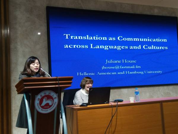 JulianeHouse教授主要从以下几个方面展开本次讲座的主题。首先,她从语言和文化的密切联系出发,强调了在翻译中构建语言和文化桥梁的必要性;其次,她着重介绍了为克服作者和读者时间和空间的分离,在翻译中语境重构的重要性、相关理论及两种重要的实现方法:显性翻译和隐性翻译。接着,她讲到了文化过滤及全球英语和翻译的关系,并列举了不同题材的生动例子。最后,她分享了对翻译人员的教育的一系列看法并进行了较为详细的说明。她认为翻译人员要广泛涉猎各类知识,掌握相关理论与研究方法,同时还要具备一定的职业素养。