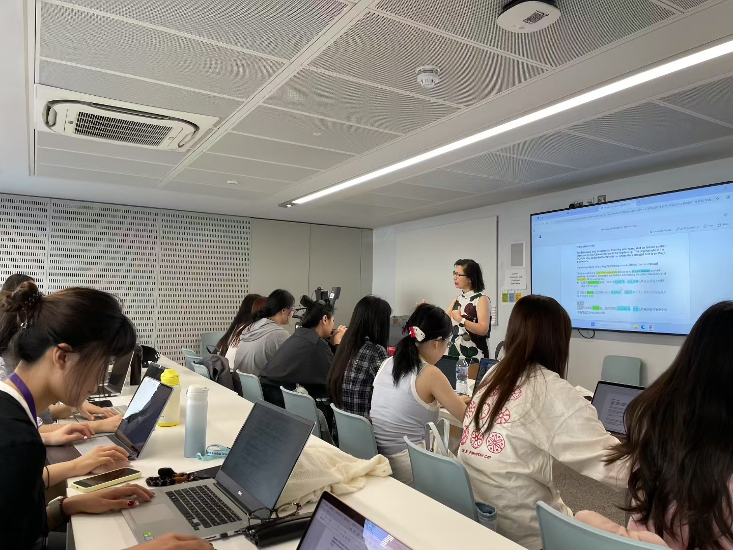 由Caiwen Wang教授授课,围绕科学和技术体裁文本的翻译展开。老师在课前布置翻译作业,课堂从translation brief切入,逐句剖析翻译技巧,涉及标点、专有名词、定语从句、被动语态、衔接与连贯等问题,并结合翻译理论加深理解,让同学们体会到了科技翻译的精准与逻辑之美。