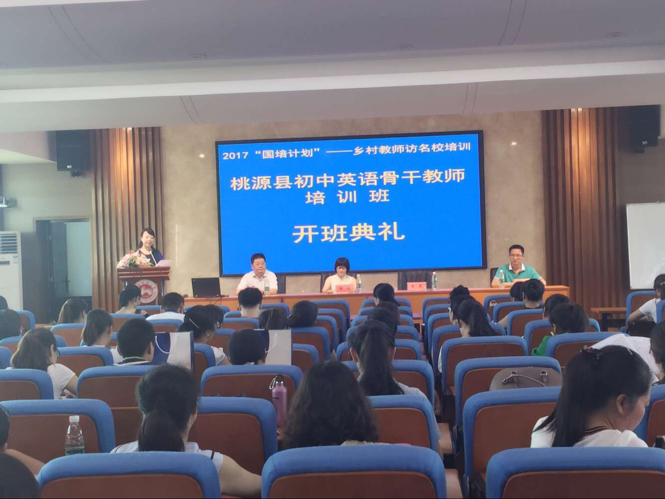 7月21日上午,2017“国培计划”——乡村教师访名校培训项目之桃源县初中英语骨干教师培训班开班典礼在太阳成官网515报告厅顺利举行。培训班领队徐娅、学院党委书记余英、教学副院长廖光蓉、行政副院长杨艺清、培训班教学班主任李洪坤等出席本次开班典礼。开班典礼由学院考试培训中心主任赵林主持。