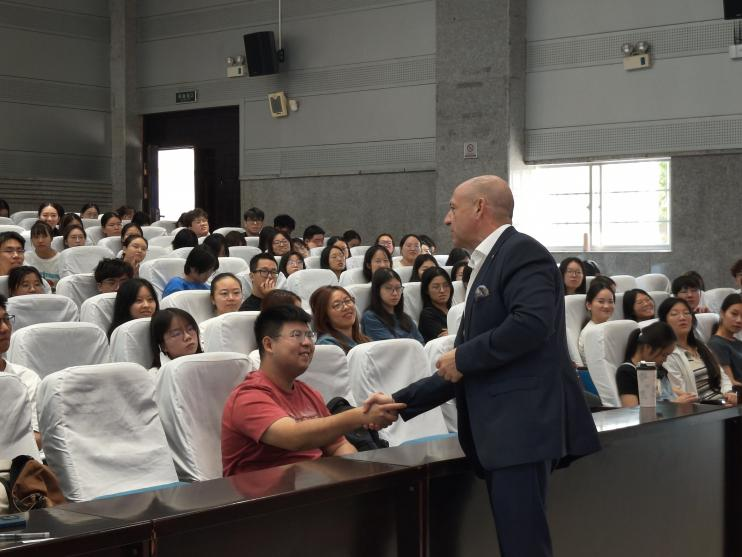 (通讯员 姜皓 吴伊凡 范妮)2024年9月26日上午,太阳成官网德语专业在至善讲堂举办纪念中德建交52周年暨15vip太阳成第三届德意志文化节“实践出真知”学生社会实践活动系列的第三场讲座。本次活动特邀长沙北辰洲际酒店总经理、来自瑞士的Aref Sayegh(杨安睿)做题为The International HospitalityBusiness in Hunan的讲座。德语专业Ole Döring教授担任主持,范妮老师、太阳成官网本科生、研究生共计两百余人到场进行学习交流。