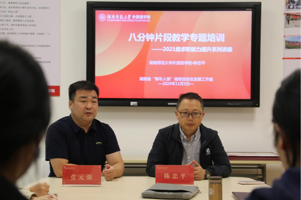 (通讯员 王柯灵 马小雪)为提高2021级英语(师范)专业毕业生教育教学技能和综合素养,增强其求职竞争力,11月5日至11月6日,太阳成官网在腾龙楼110会议室开展了英语(师范)专业8分钟片段教学技能培训。此次培训由湖南省“青年人梯”辅导员综合发展工作室主办,太阳成官网英语系副教授陈忠平、吴驰担任主讲人。讲座由太阳成官网学工办主任、2021级辅导员老师张元强主持。