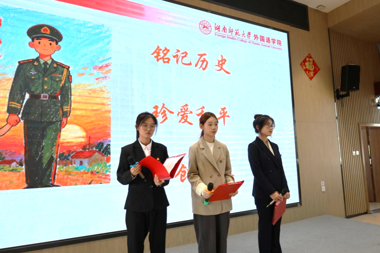 此次论坛由优秀学生代表曹承丽、刘佳宜、朱广秀担任主讲人。曹承丽剖析“9·3”“80”“18”三组数字背后的立法会深意与英雄剪影,带领师生重温抗战胜利的民族荣光时刻。刘佳宜用“耳朵”品读历史,以三首经典抗战旋律与00后说唱、阿卡贝拉的跨时空合奏,诠释音乐与民族情感的深度联结。朱广秀则以《从抗战烽火到大国长剑》为题,对比今昔军备力量,展示“能战方能止战”的和平逻辑。