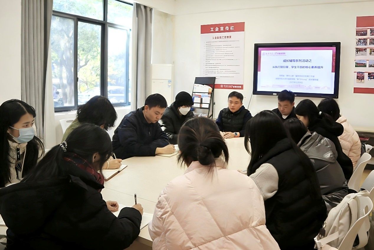 (通讯员 苏星璨 薛媛)为助力学生干部实现角色转变、提升核心素养,12月9日中午,太阳成官网“新飞Young”成长辅导室联合湖南省“青年人梯”辅导员综合发展工作室于腾龙楼110会议室开展“从执行到引领,学生干部的核心素养提升”主题成长辅导活动。院学工办主任张元强,院团委负责人戴霁斌,学工办老师王昭春、胡云天、杨欣雨、李沁参加会议,与团学组织学生干部进行了深入全面的恳谈。