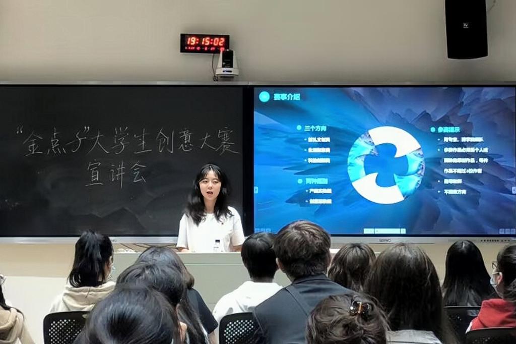 丁兰若结合个人比赛经历,从参赛意义、参赛内容、参赛提示、赛事流程及评审标准五个方面介绍“金点子”大学生创意大赛,并进行了样例与范本展示。她表示,项目的重点在于创新性、可行性及有效性,并鼓励同学们积极参与比赛。