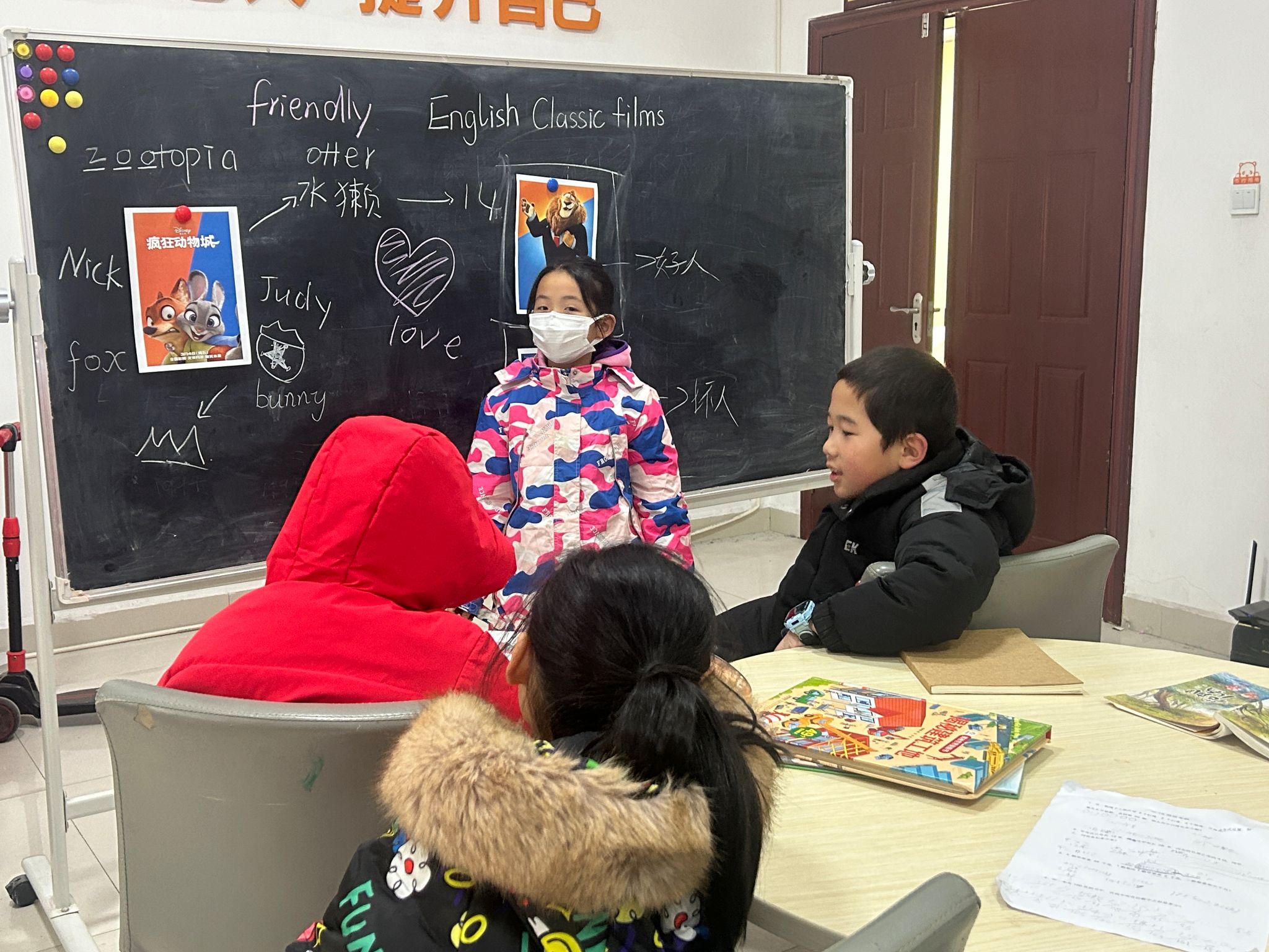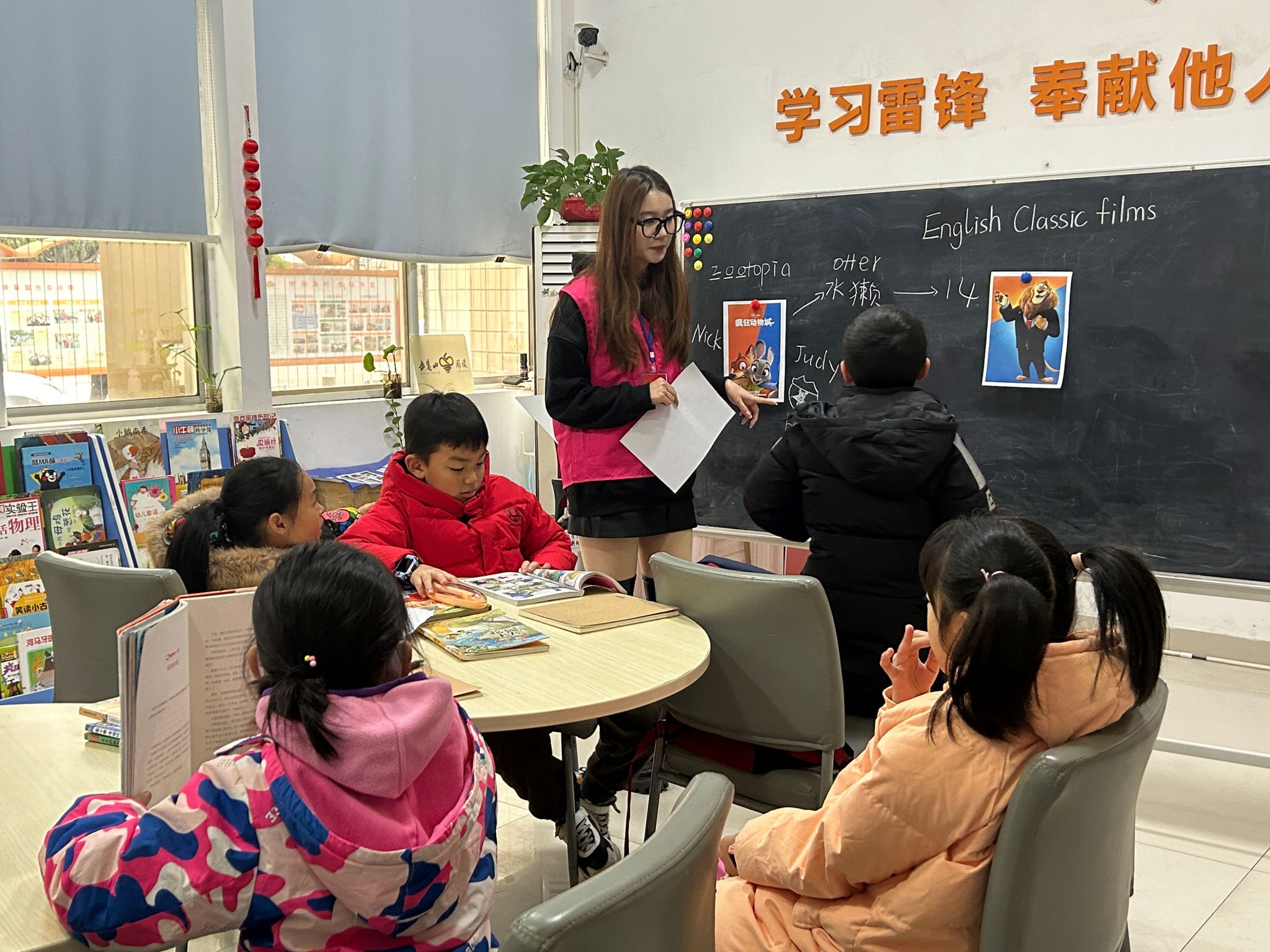 志愿者以电影《疯狂动物城》为切入点,结合图片讲述电影情节,同时将角色的固有印象与在电影中的定位进行对比,引导同学们思考每个角色背后的意义,教导小朋友们不要以貌取人。同时,志愿者们还列举了《铁扇公主》《喜羊羊与灰太狼大电影之筐出未来》等中国经典电影,从电影创作依据、核心精神体现等方面比较了中国电影与英美电影的文化差异。