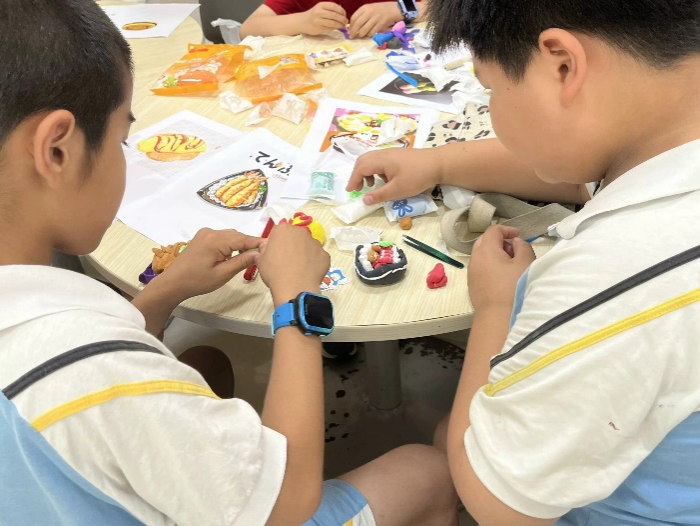 课堂从“日本美食”与“日本饮食文化”两方面展开。志愿者们首先从小朋友们耳熟能详的日本动漫角色入手,引入此次的课堂主题“日本美食”。通过图片展示的形式,志愿者们向小朋友们介绍了铜锣烧、拉面、寿司等日本美食,并说明了料理的原材料、料理的食用方式;志愿者们在教学过程中还穿插了美食的日语教学。此外,小朋友们通过视频,还了解了铜锣烧的制作过程。在此过程中,志愿者们以有奖竞猜的形式调动课堂氛围,小朋友们积极回答问题,课堂氛围活跃;在讲解日本的饮食文化时,志愿者们以视频的形式展现了日本的用餐礼仪并联系生活实际,引导小朋友们对比中日用餐礼仪的异同,促进小朋友们对课堂知识的理解。而为了增强小朋友们的课堂参与感,志愿者们还准备了粘土,鼓励小朋友们动手捏出自己喜欢的美食;小朋友们积极参与,共同合作,捏出美味“食物”。